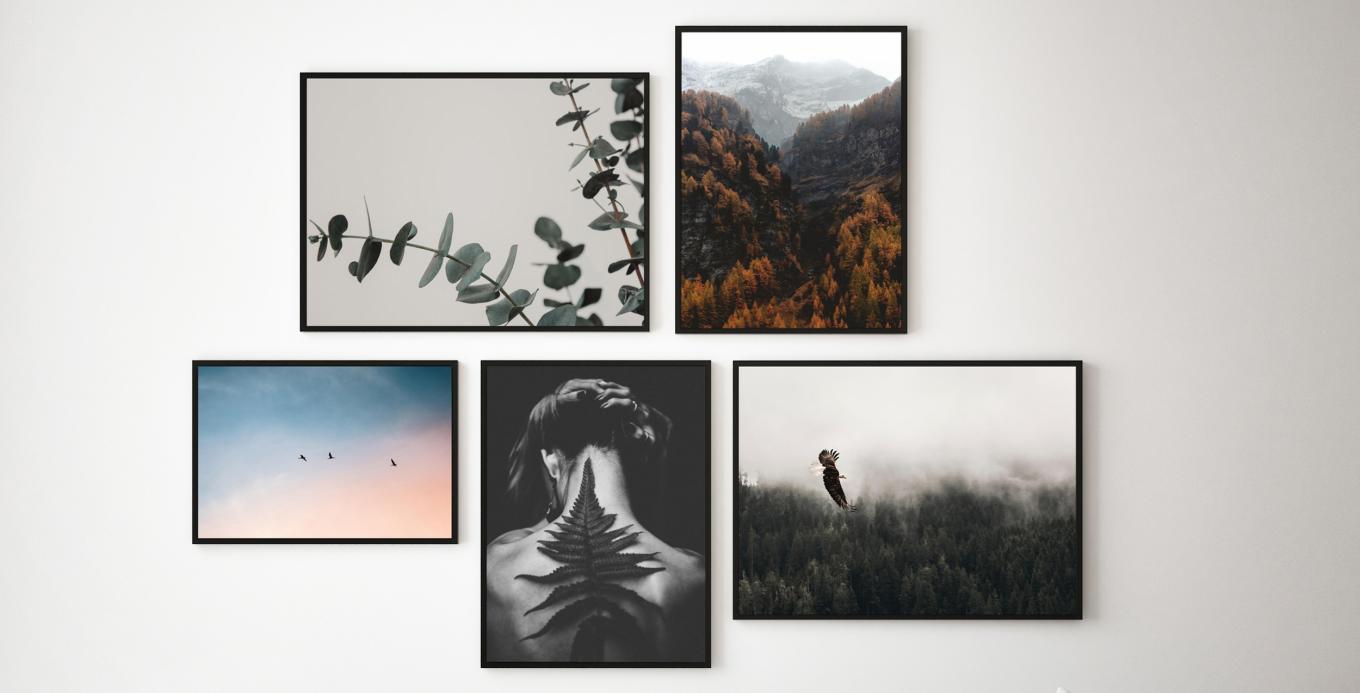 Como uma parede de quadros é composta por várias imagens, isto também significa várias molduras e vários motivos. Com isto queremos dizer que tanto as molduras como os motivos irão afetar a aparência da parede, por isso pode ser uma boa ideia pensar um pouco sobre que tipo de impressão pretende que a constelação passe.