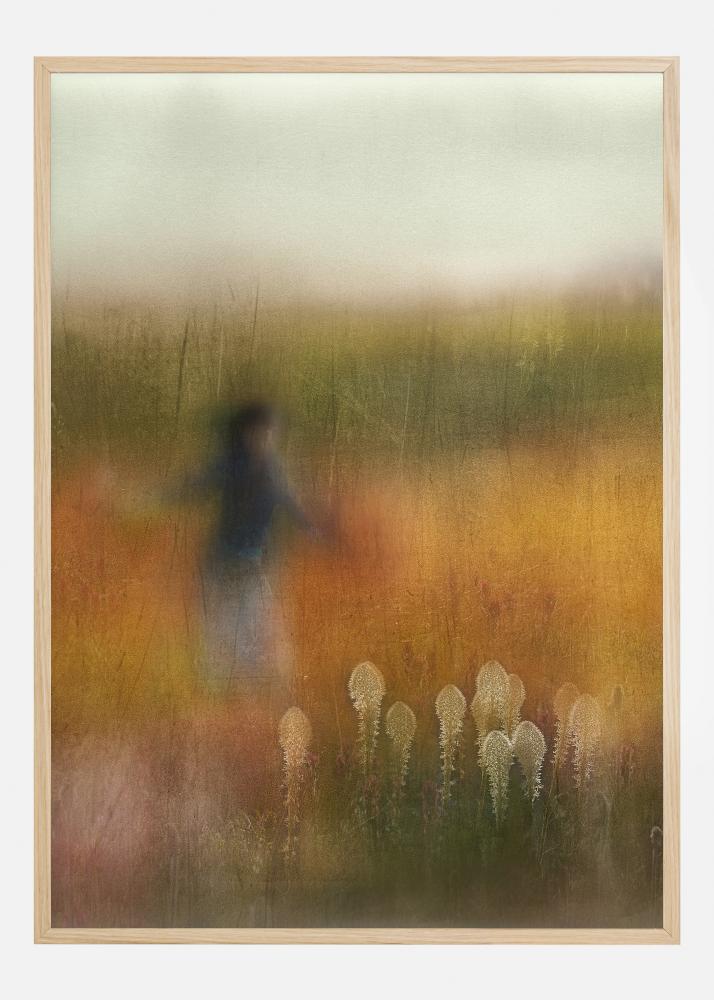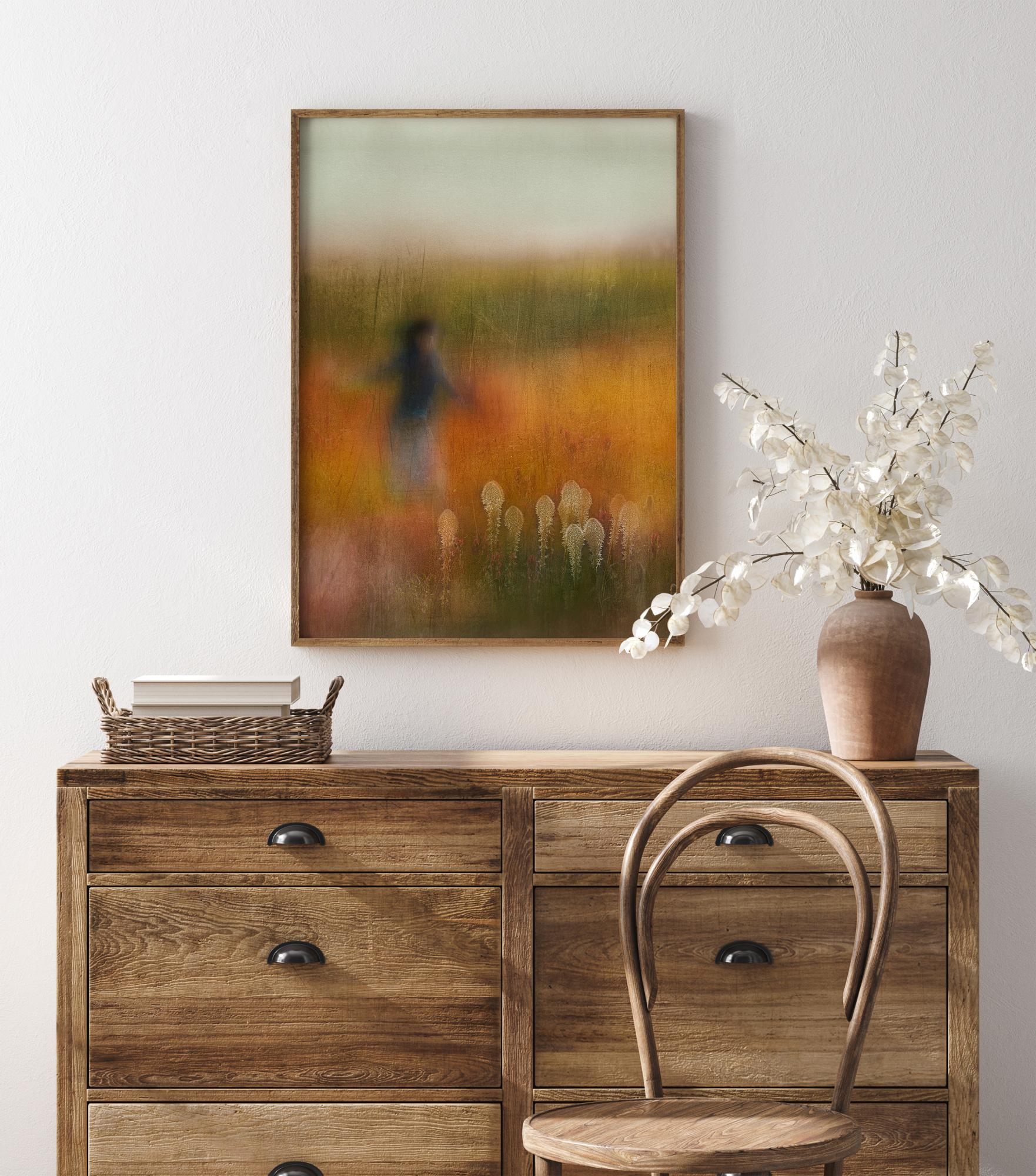 Um póster abstrato com uma garota em uma longa grama de urso. A imagem parece uma pintura suave com cores amarelas e verdes que evocam uma sensação de primavera. A garota desfocada se move através das pinceladas fortes na grama para criar movimento em toda a imagem. Pendure isso em sua casa para ter um ótimo ponto de partida para conversas.