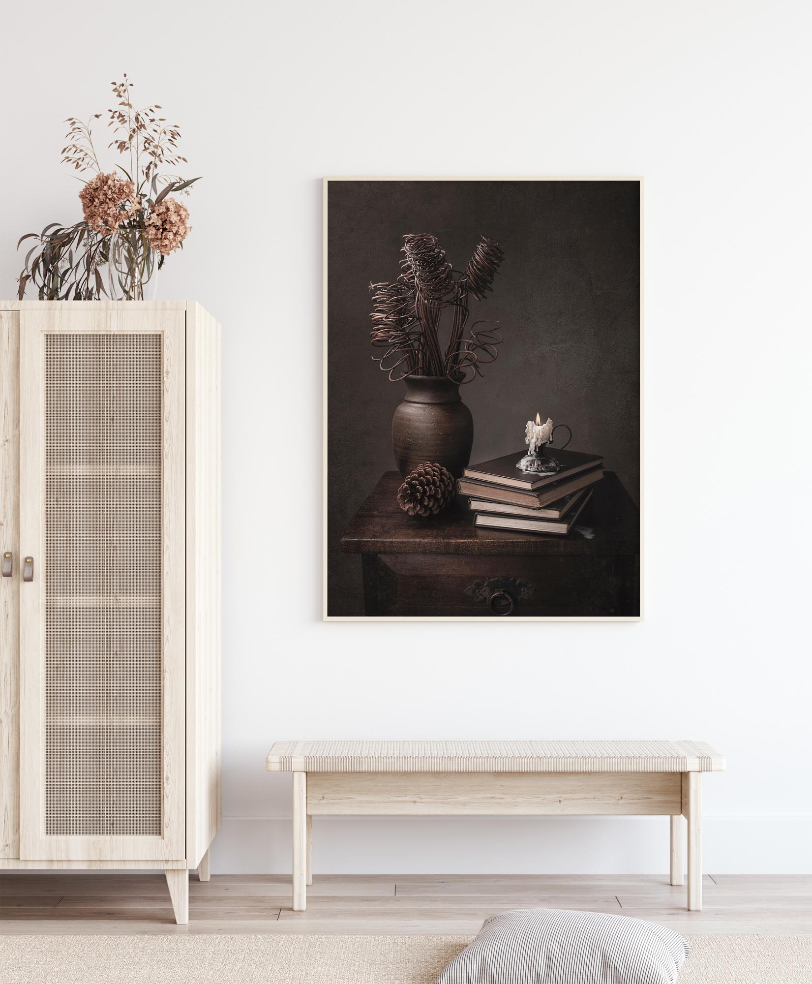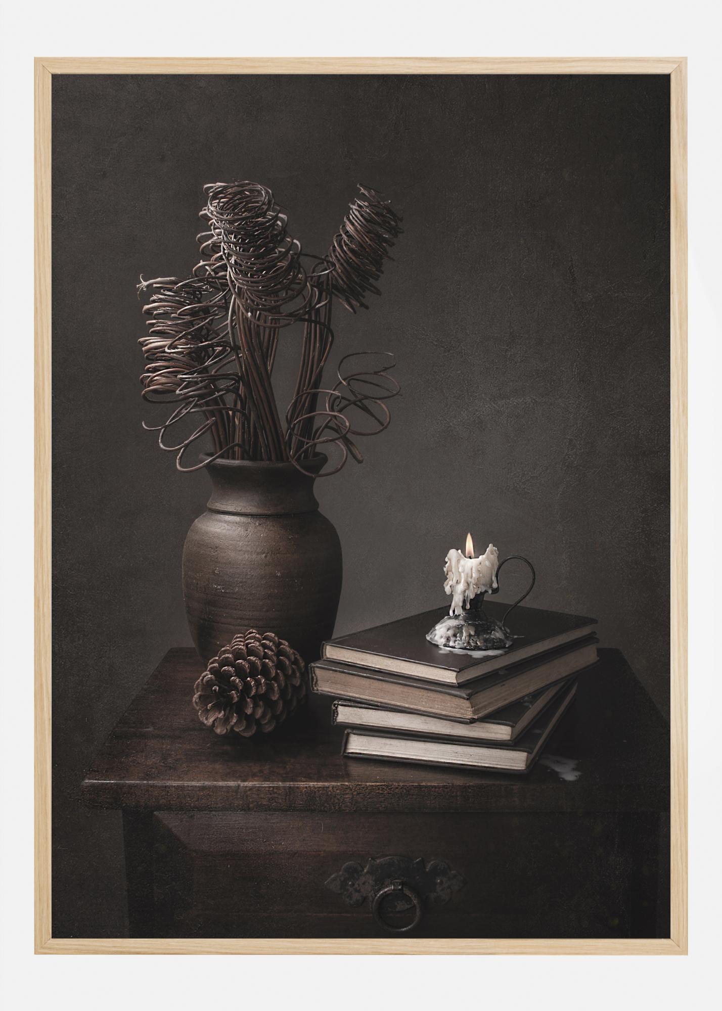 Um póster llamativo de natureza morta com uma jarra, um cone de pinheiro, livros e uma vela em uma antiga cómoda. As espirais da planta seca atraem o olhar para a cera derretida e a chama da vela. As cores sépia escuras proporcionam uma sensação misteriosa de um tempo passado.