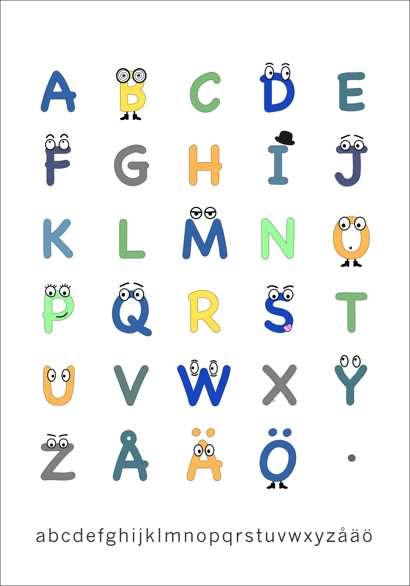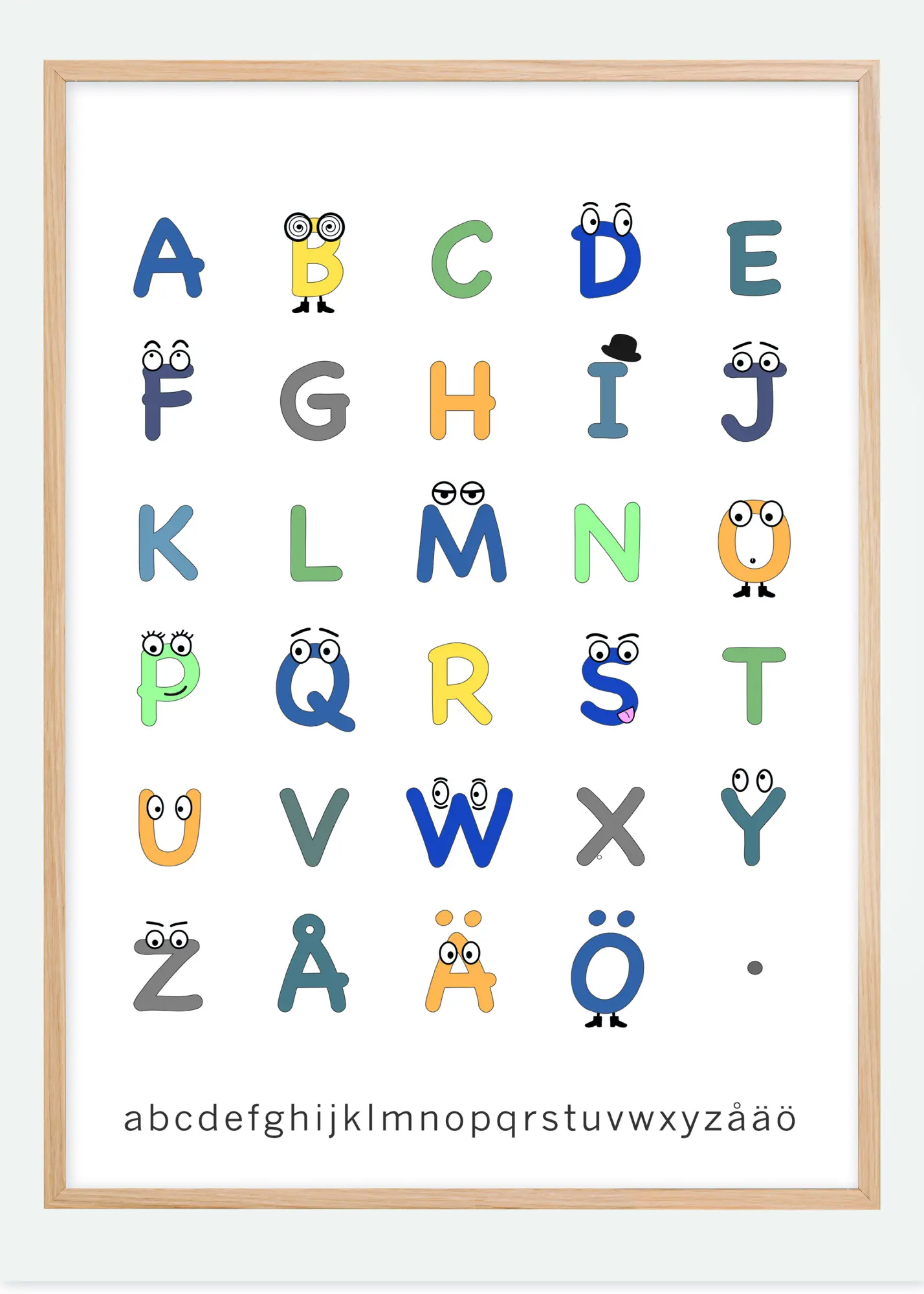 Um póster de alfabeto adorável que mostra cada letra de uma maneira inteligente. Desfrute das cores primárias neste póster simples, mas memorável. Algumas das letras também têm olhos para criar um personagem pessoal nas letras. Pendure isso na parede para ajudar as crianças a lembrarem mais facilmente do alfabeto, tornando tanto o tempo escolar quanto o aprendizado mais divertidos.