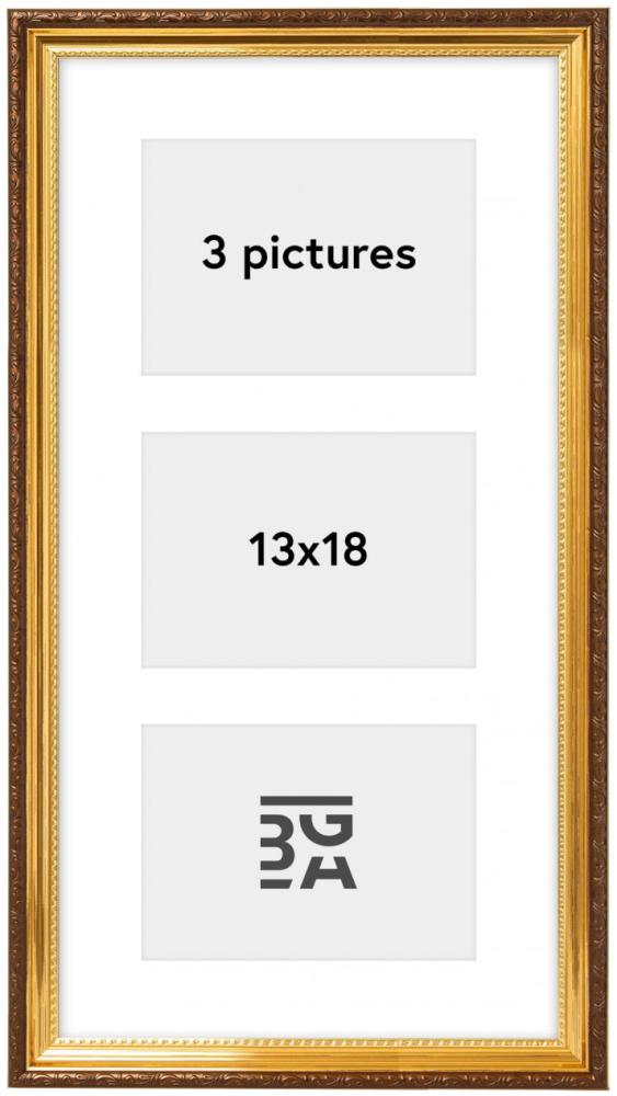 Com esta moldura de colagem, você pode decorar a sua parede com fotos da família, amigos e lembranças fotográficas de momentos especiais da vida. A moldura tem espaço para 3 fotos no tamanho 13x18 cm. A moldura dourada possui um belo estilo retrô, com uma borda decorativa em um tom quente de marrom. Suporte para fixação na parede incluído.