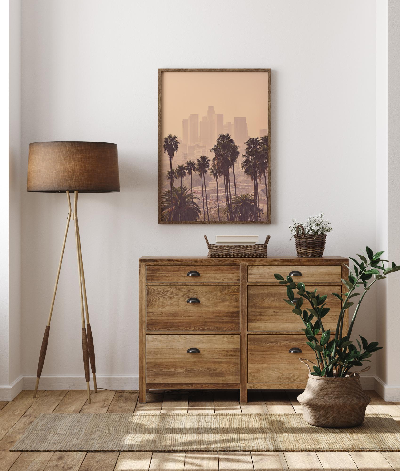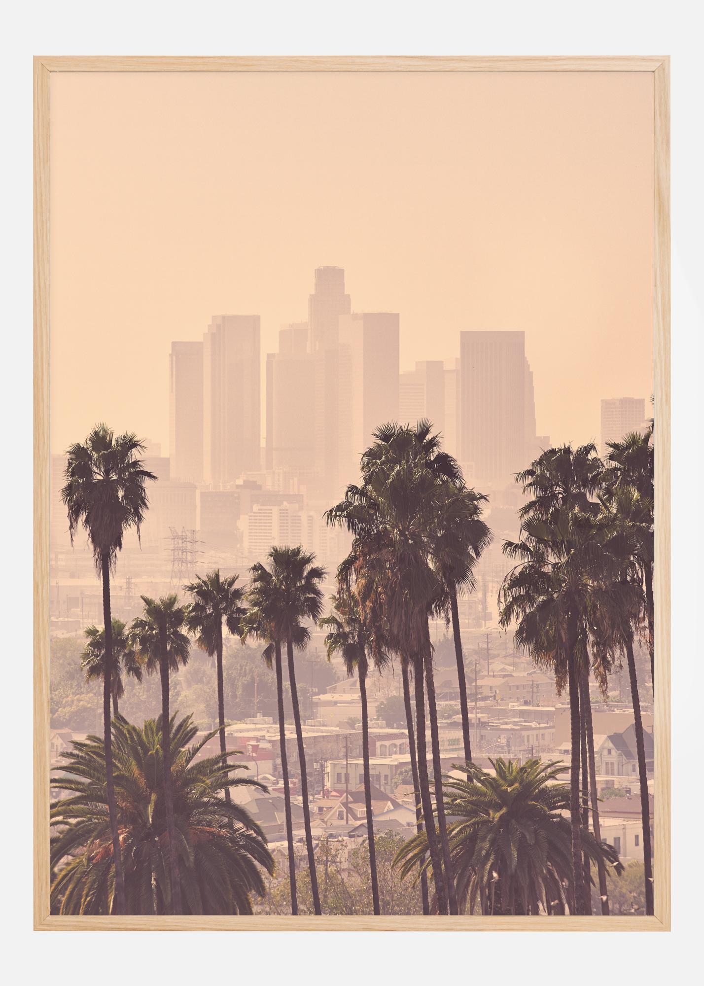 Um póster com uma paisagem urbana com palmeiras-rabo-de-raposa em primeiro plano e a silhueta de uma cidade ao fundo. As palmeiras estão em foco nítido e os arranha-céus nebulosos ao fundo destacam a natureza. Pode sentir a aura da vida urbana nesta obra expressiva em tons de sépia.