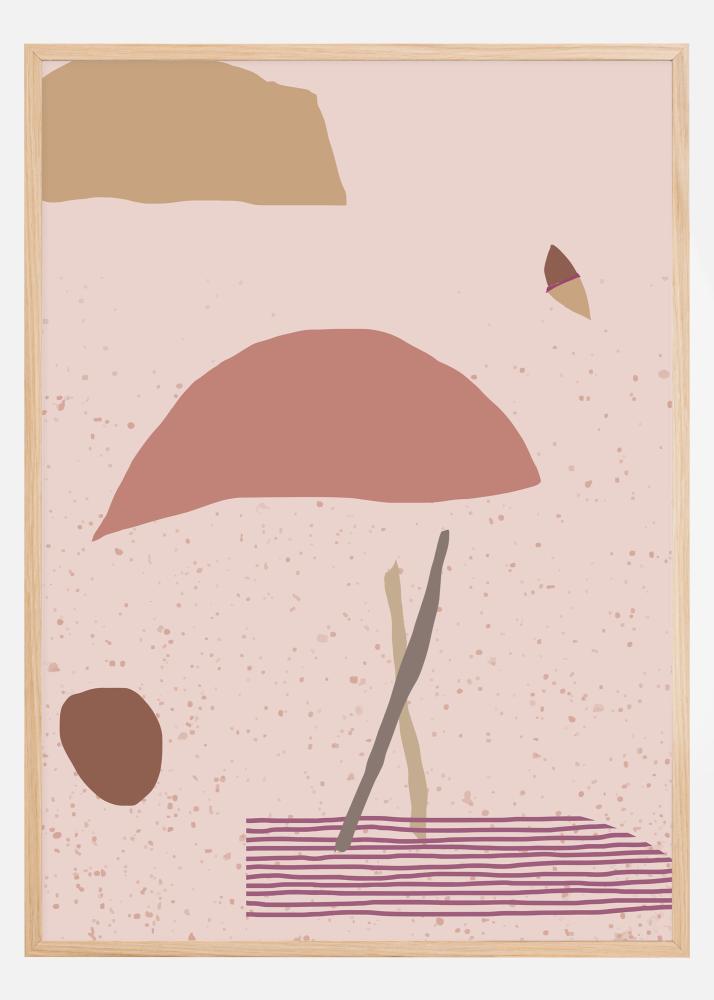 Um póster abstrato com formas vermelhas, bege, rosa e lilás num fundo manchado suave. Desfrute do efeito calmante das formas e reflita sobre o significado quando vê uma bola, uma forma de nuvem, gravetos, tapete ou guarda-chuva na obra. Os tons suaves são perfeitos, por exemplo, para uma parede de casa de banho.