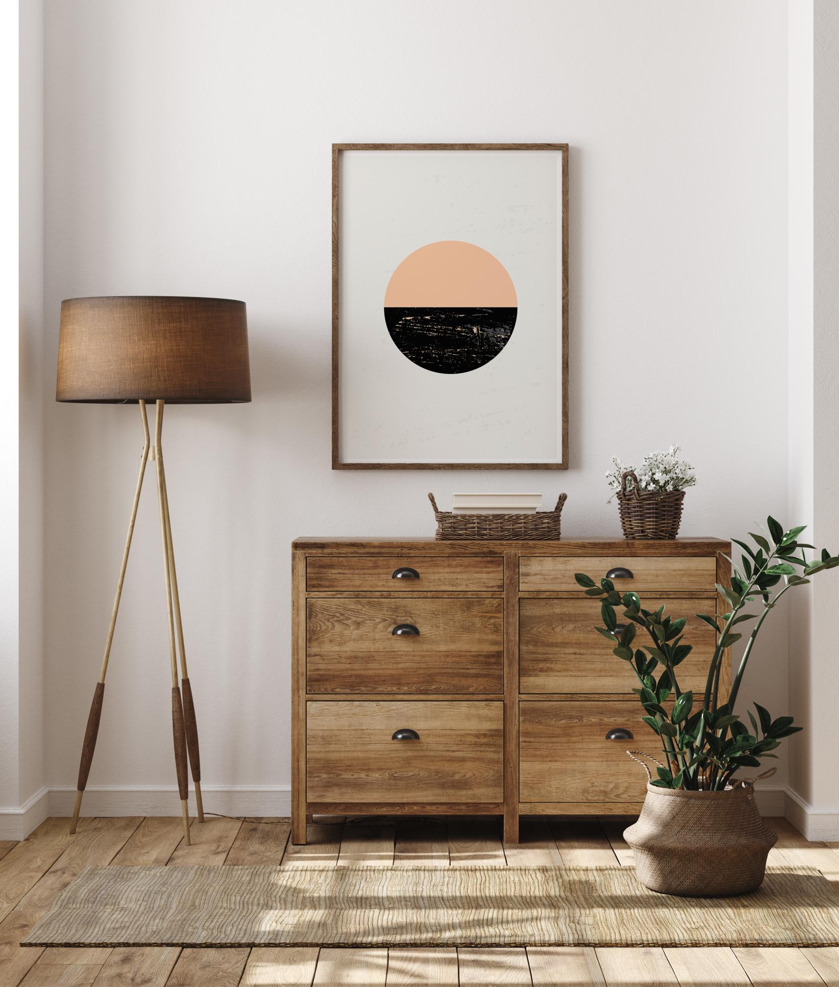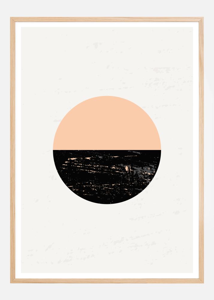 Um póster minimalista com um círculo em duas cores diferentes. O círculo está num fundo branco, com a metade superior em um tom suave de pêssego que puxa para o rosa. A metade inferior é preta, com uma paisagem urbana noturna, onde as luzes piscam no escuro. Com essa imagem em casa, terá uma boa base para discussões.