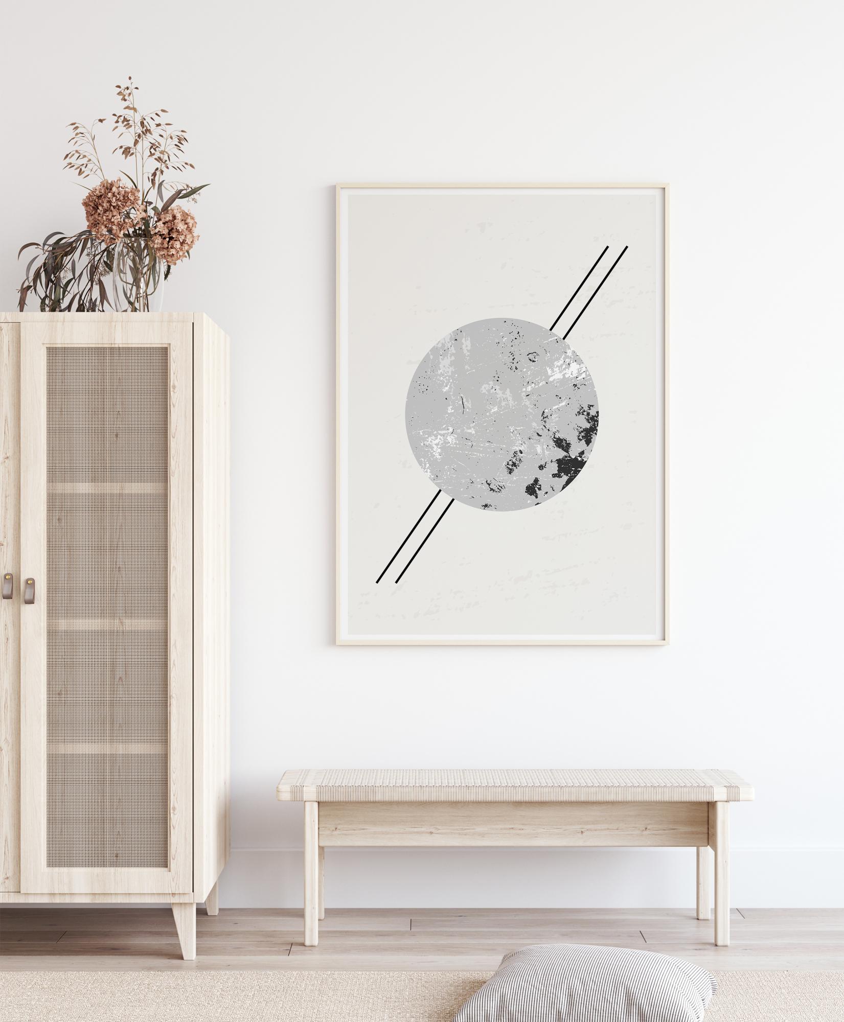Um póster abstrato com um círculo com duas linhas retas passando por ele. Os tons suaves de cinzento do círculo contrastam com um efeito de mármore cinzento escuro e branco, que quase se assemelha à Terra vista do espaço. Fique contemplativo quando este estiver pendurado numa parede com cores pastel suaves.