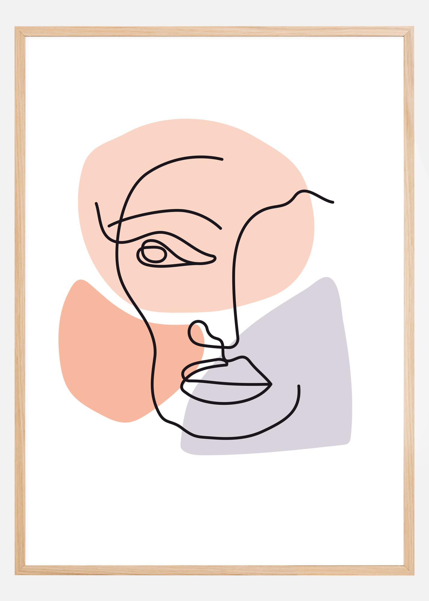 Um póster abstrato de um rosto contemplativo que desperta curiosidade. Linhas finas e pretas criam o nariz, os olhos, a boca e o queixo deste rosto atento. Formas suaves em azul, rosa e pêssego estão presentes abaixo para dar forma ao rosto. Combine-o com uma parede de cor forte para criar uma declaração real que estimula a imaginação.