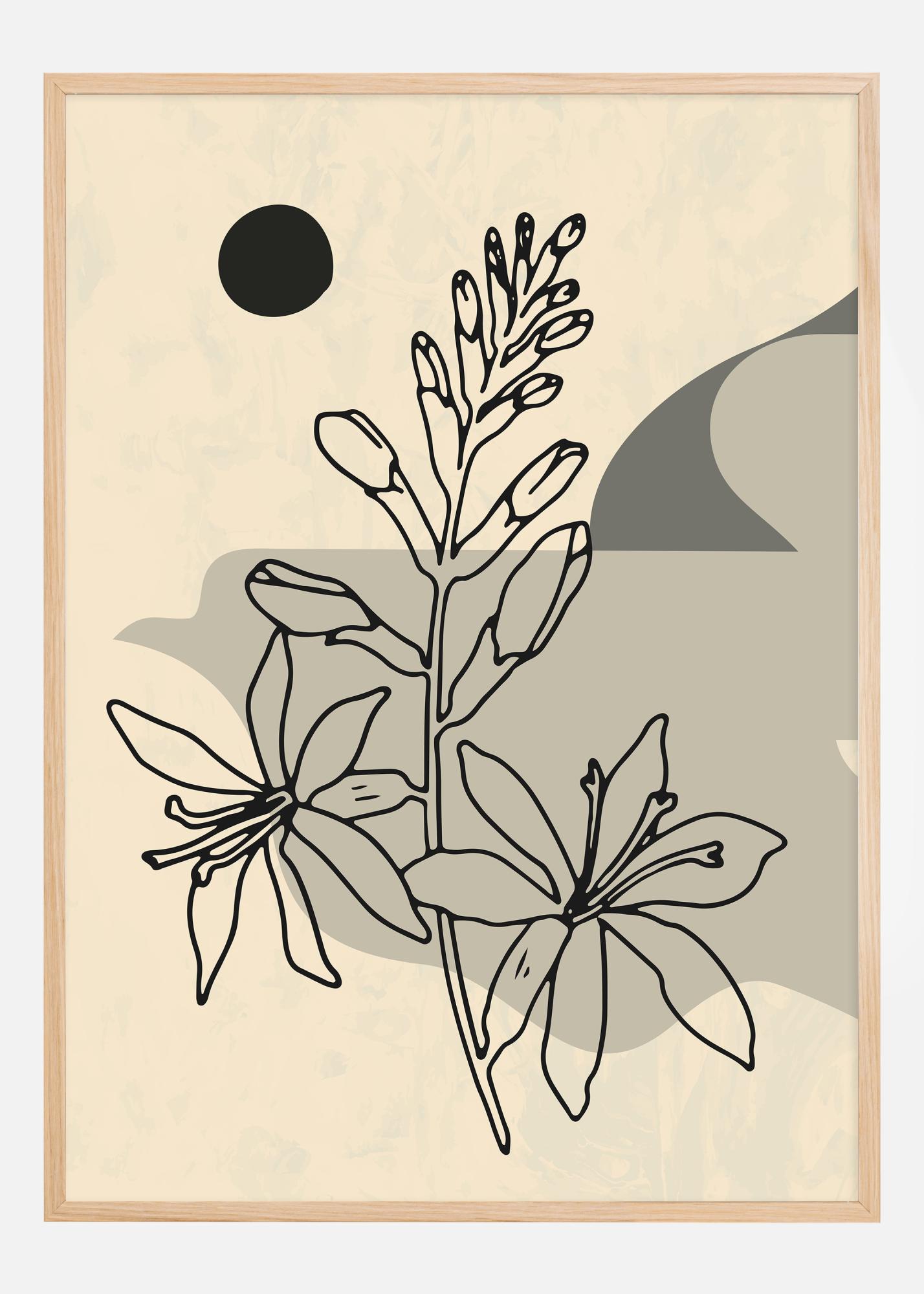 Este cartaz esteticamente atraente captura uma interpretação abstrata de flores em flor, onde linhas gráficas encontram formas orgânicas. A obra é apresentada sobre um fundo neutro em bege, complementado por uma forma circular escura que oferece contraste e profundidade. Em primeiro plano, flores e botões estilizados estendem-se para cima em silhueta, criados com contornos pretos nítidos que proporcionam um forte efeito visual.