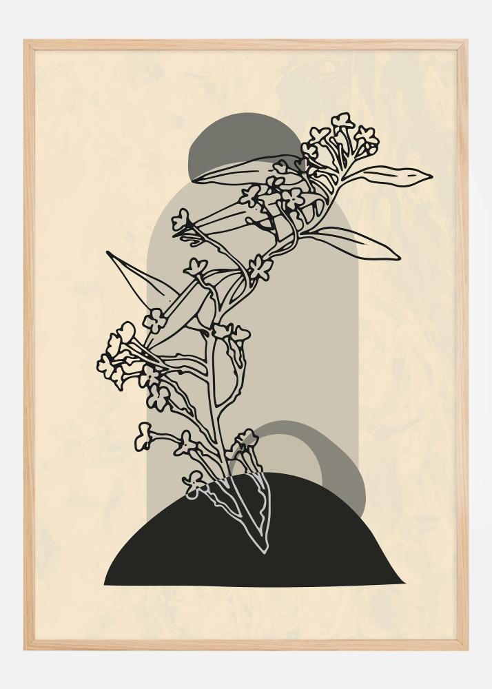 Este pôster sofisticado representa uma inflorescência abstrata que combina formas naturais com elementos gráficos para uma sensação contemporânea. O motivo utiliza uma paleta de cores sutil com tons suaves de bege e linhas pretas ousadas, o que cria um contraste que é ao mesmo tempo impressionante e elegante. O design dá grande importância à composição e ao equilíbrio, posicionando as formas orgânicas de flores e folhas sobre uma meia-círculo preto sólido, que cria uma ilusão de sombra e profundidade.