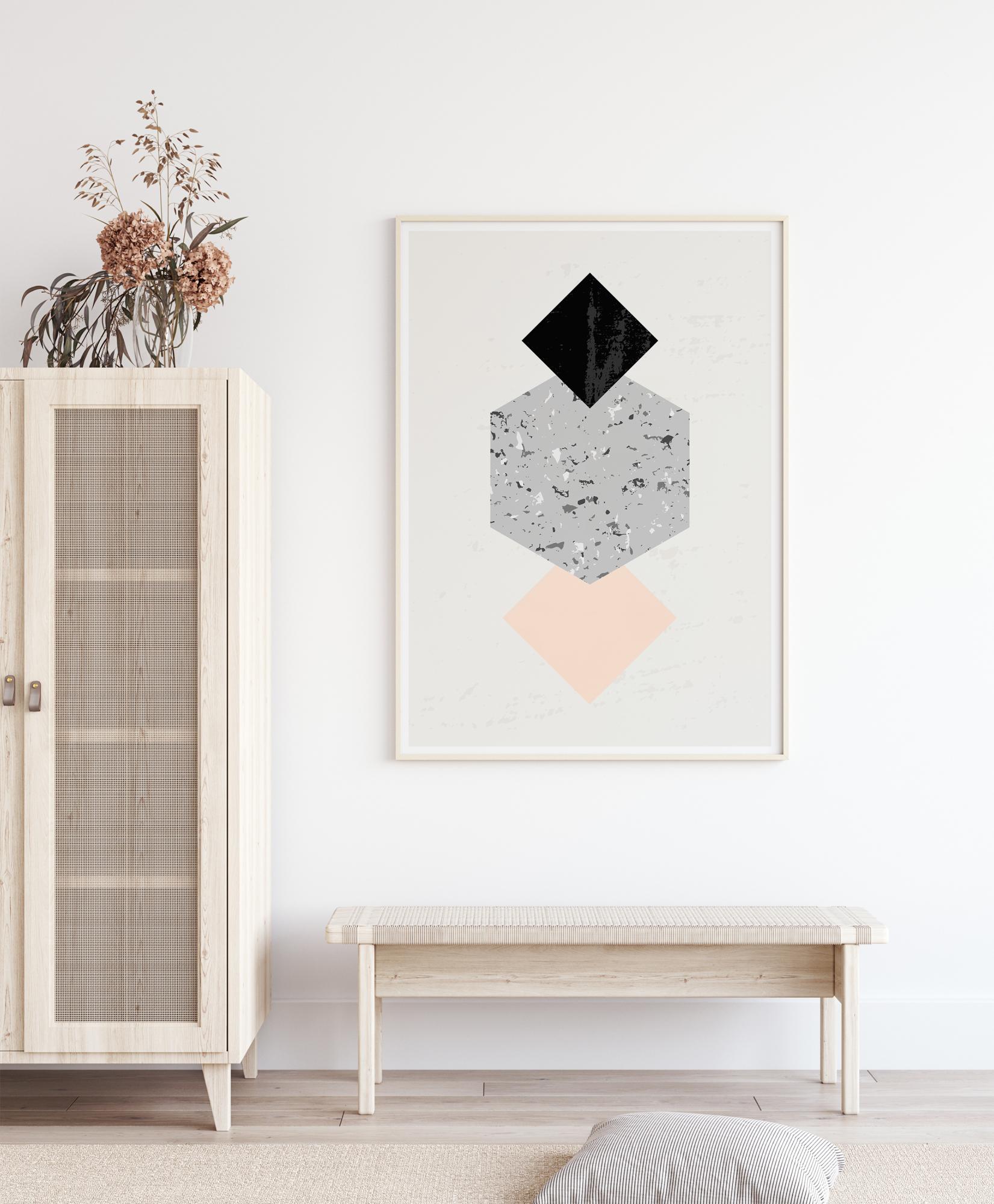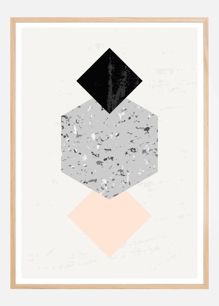 Um póster abstrato geométrico com duas caixas diferentes. Embora sejam bidimensionais, os ângulos das caixas dão a ilusão de cubos. Esses cubos estão preenchidos com pedras divertidas e pontos de cor em azul, cinzento e preto. Crie uma parede dramática ao combinar esta peça simples com uma parede de cor ousada.