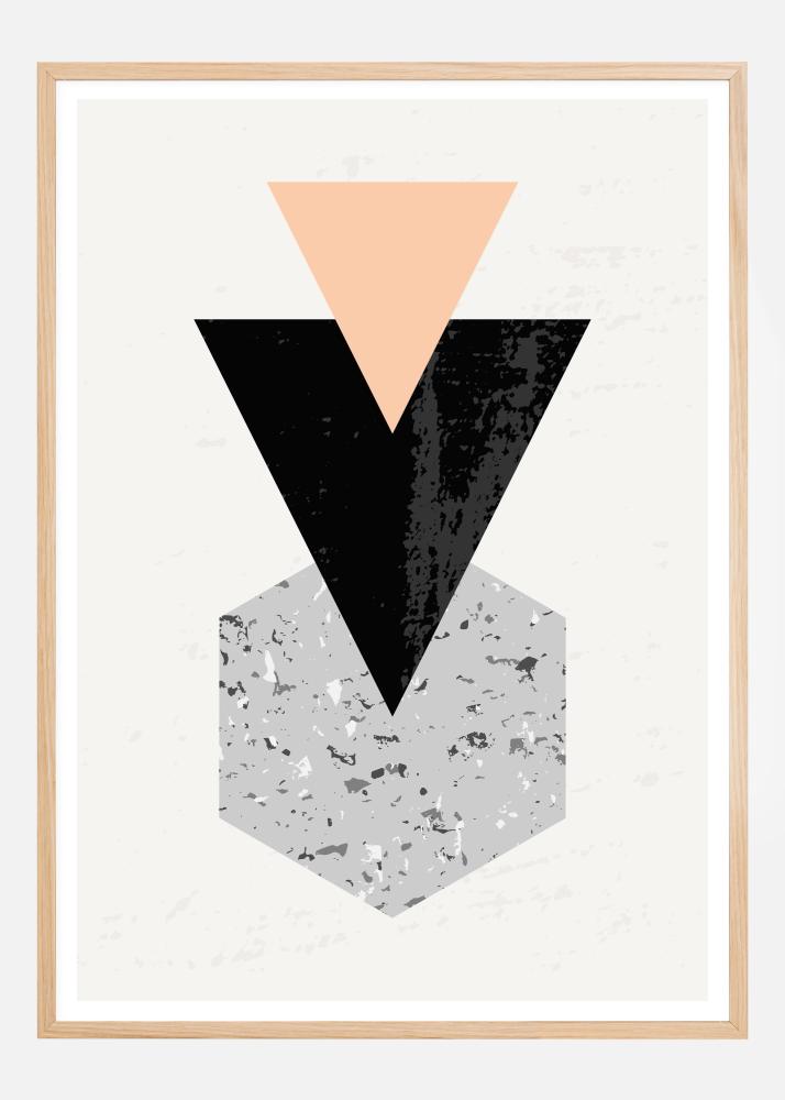 Um póster geométrico triangular com formas claras e ousadas. Os dois triângulos em rosa e preto apontam para baixo, direcionando o olhar para o cubo azul mais suave e pontilhado. O triângulo preto centralmente posicionado mantém o foco, tornando-o uma apresentação perfeita para o home office, com o seu design menos distrativo que é compatível com qualquer ambiente.