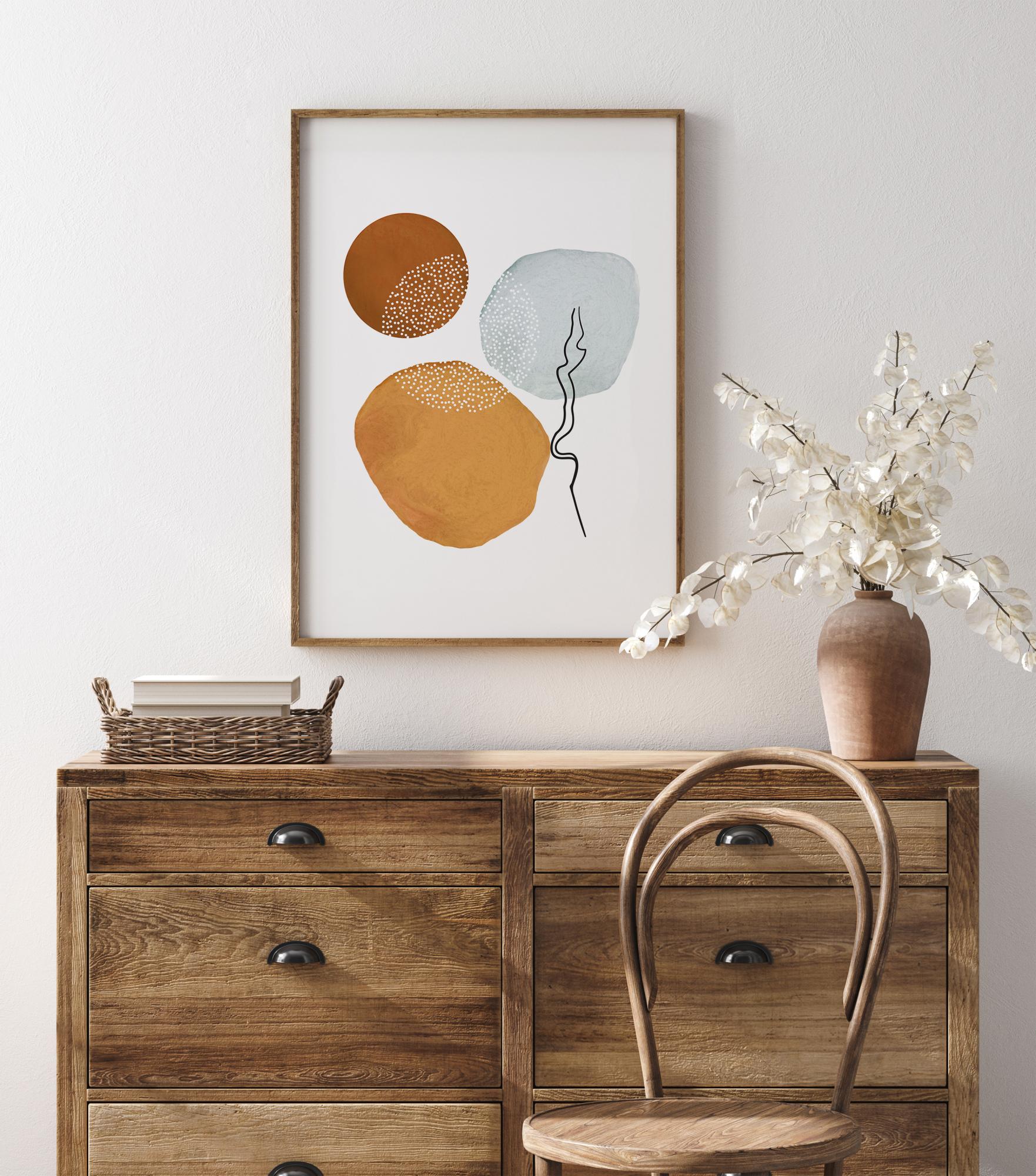 Um póster abstrato simples com três formas circulares principais. Sobre essas três formas, há uma sobreposição de um círculo composto por pequenos pontos brancos, semelhante a um dente-de-leão. Duas linhas simples se entrelaçam sobre a forma azul e unem a obra como um todo. Esta impressão é um excelente complemento para uma galeria de parede sofisticada.