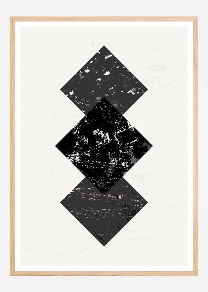 Um póster geométrico com três quadrados escuros que estão nas suas pontas. Dois quadrados azul-marinho estão acima e abaixo de um quadrado preto maior. Todos são realçados com pontos e manchas brancas sobre eles para criar um conjunto interessante de padrões. Combine esta obra de arte com uma parede azul e deixe as formas se destacarem.
