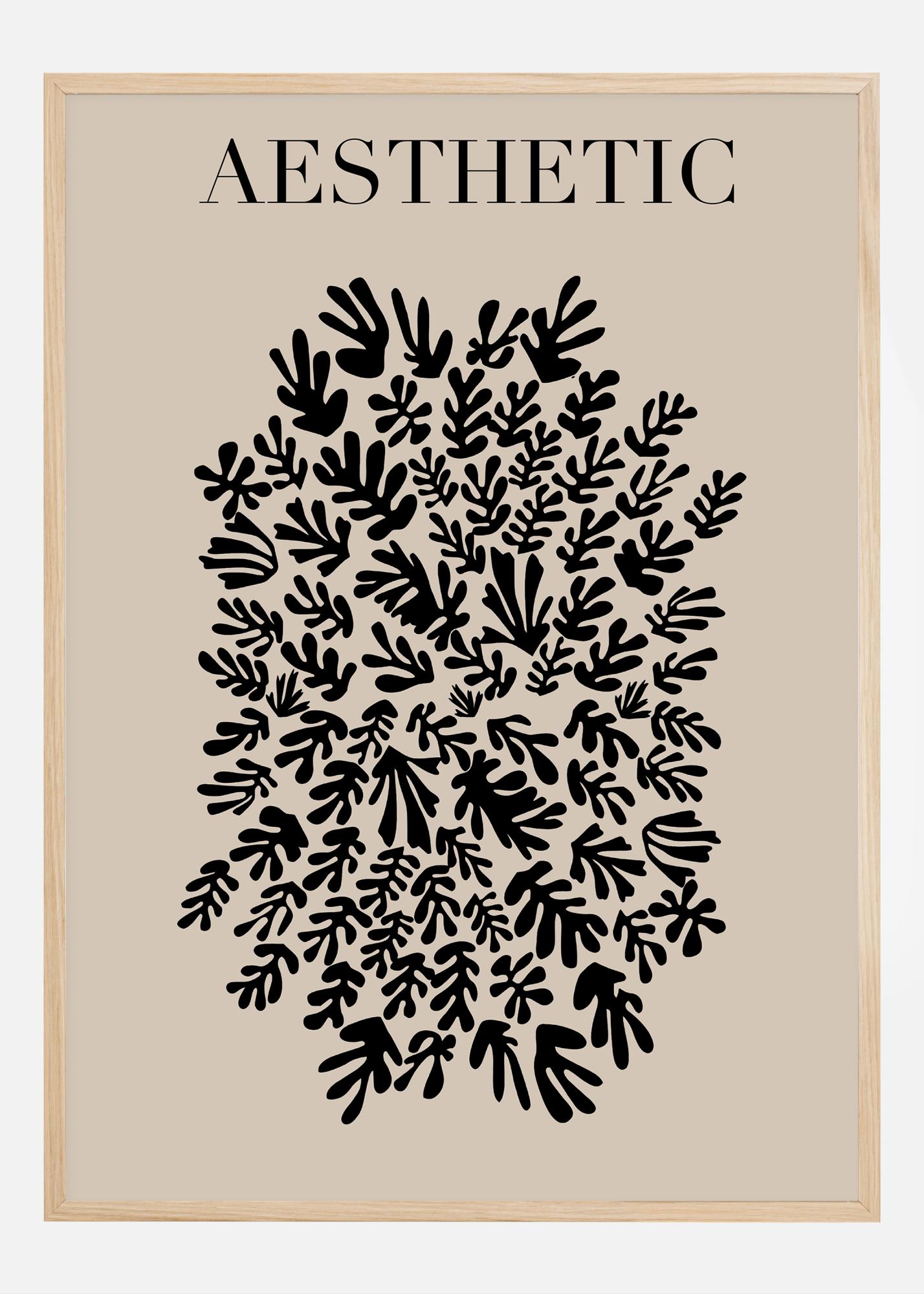 Com sua expressão moderna e paleta de cores simples, limitada a preto e bege, esta impressão transmite uma impressão calmante e equilibrada. A palavra "AESTHETIC" posicionada na parte superior do motivo funciona como um lembrete poderoso da beleza eterna do design e da natureza. Este pôster seria excelente em um ambiente onde se deseja criar um oásis de tranquilidade e inspiração, ou como parte de uma parede de quadros maior para criar uma experiência visual coesa.