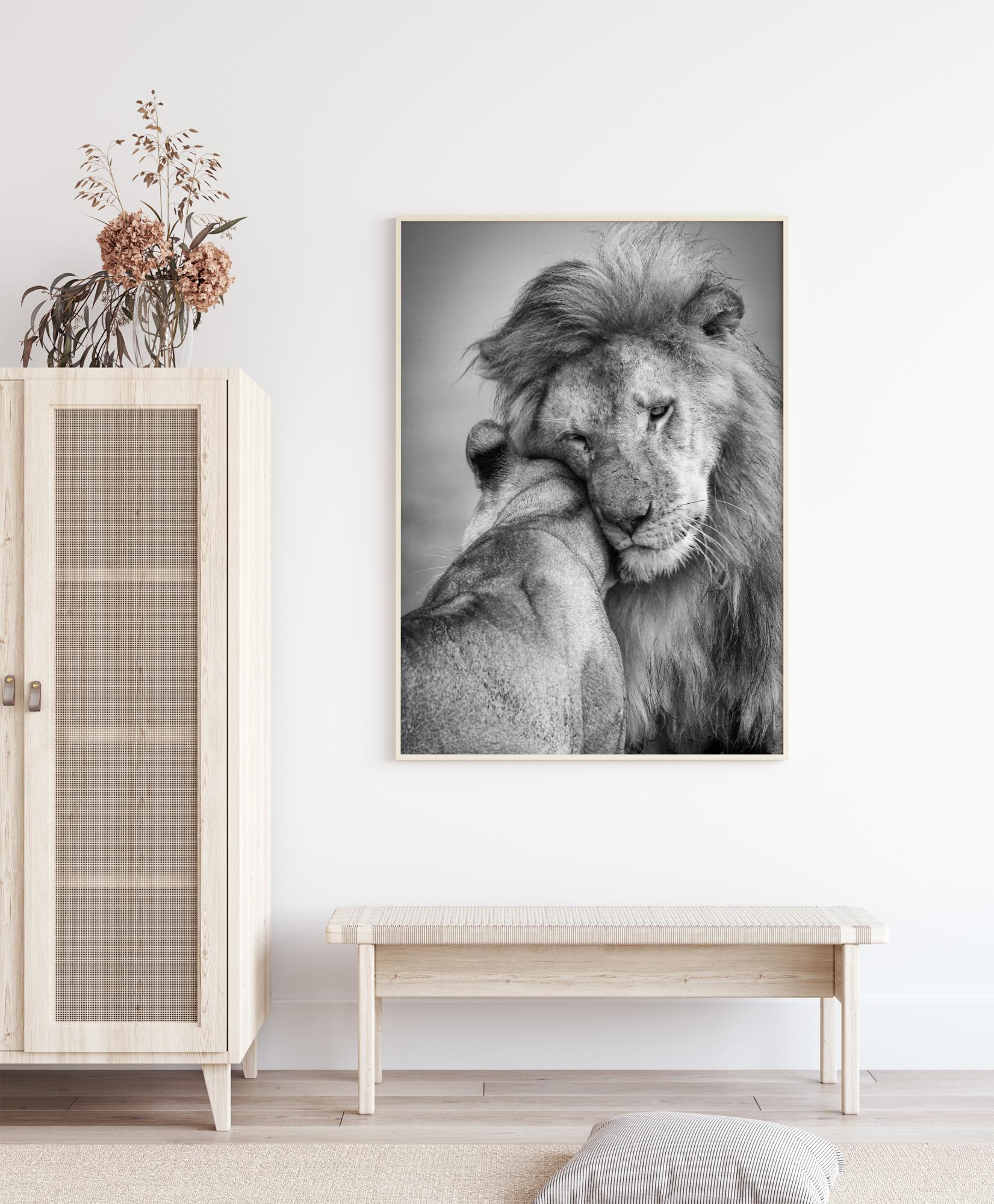 Um póster da natureza com um leão e uma leoa em um momento carinhoso. Nesta incrível imagem em preto e branco, pode ver o leão macho abraçando sua leoa enquanto ela está de costas para ele. Experimente o amor neste abraço caloroso todas as manhãs quando acordar.