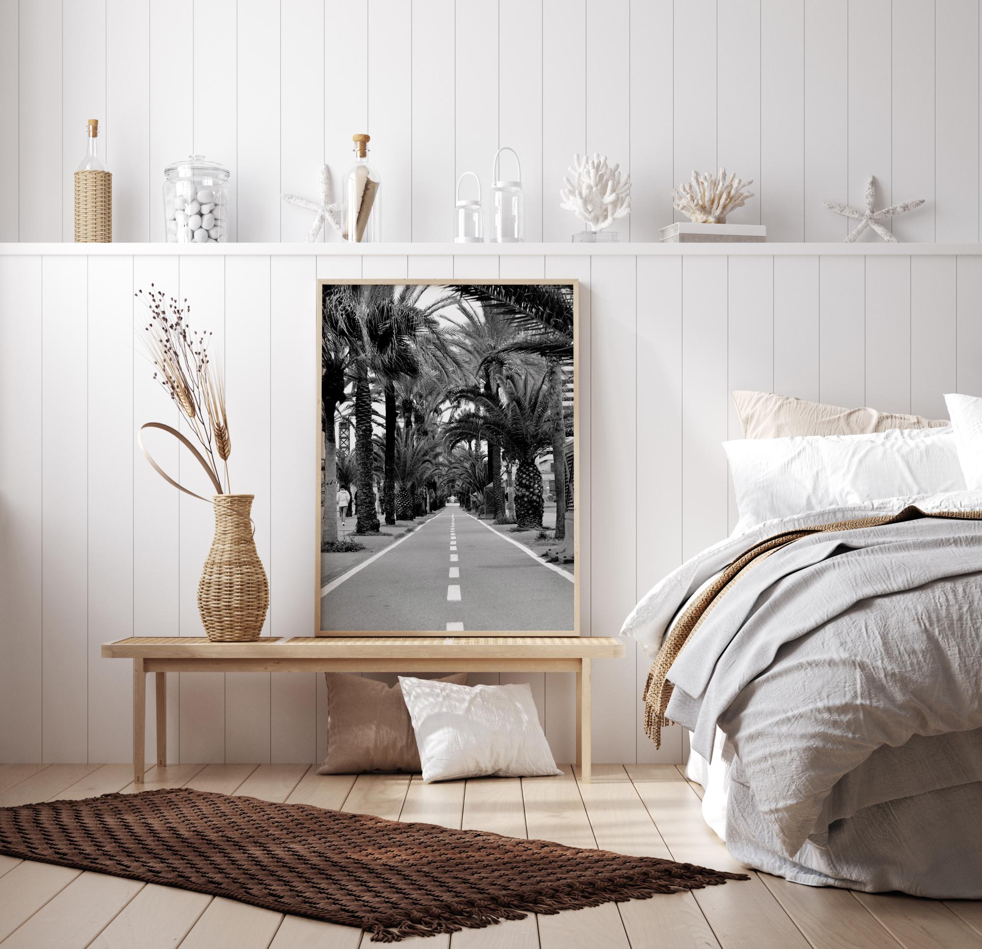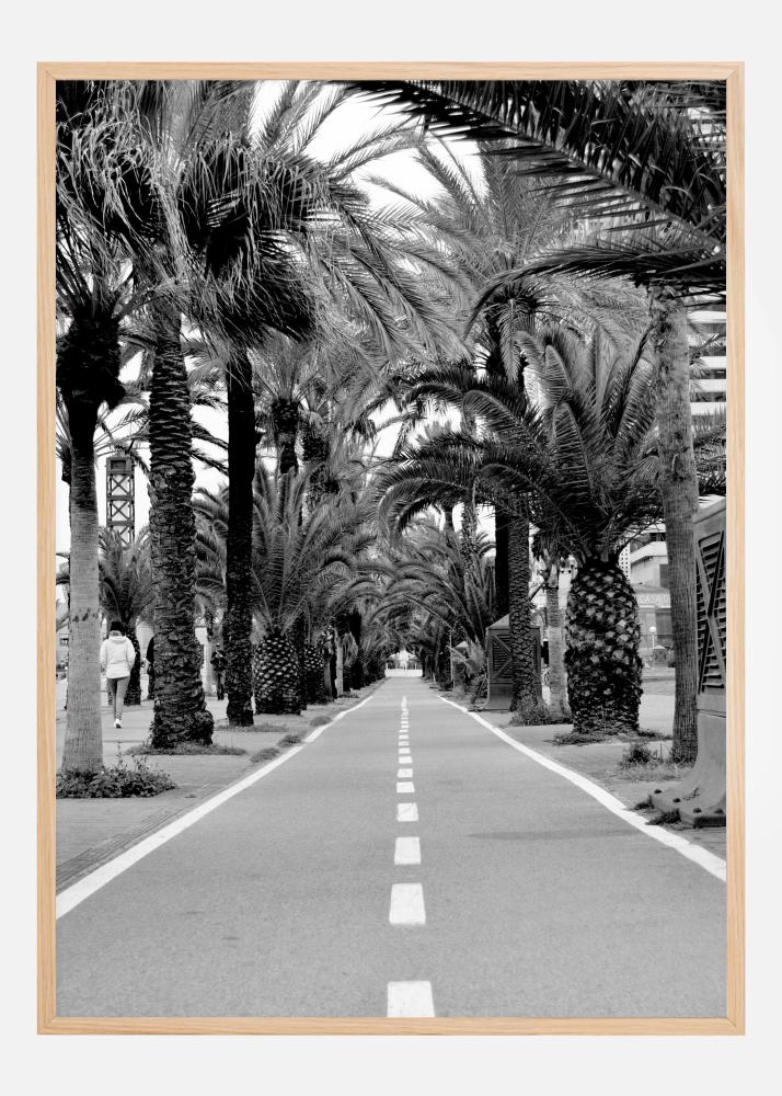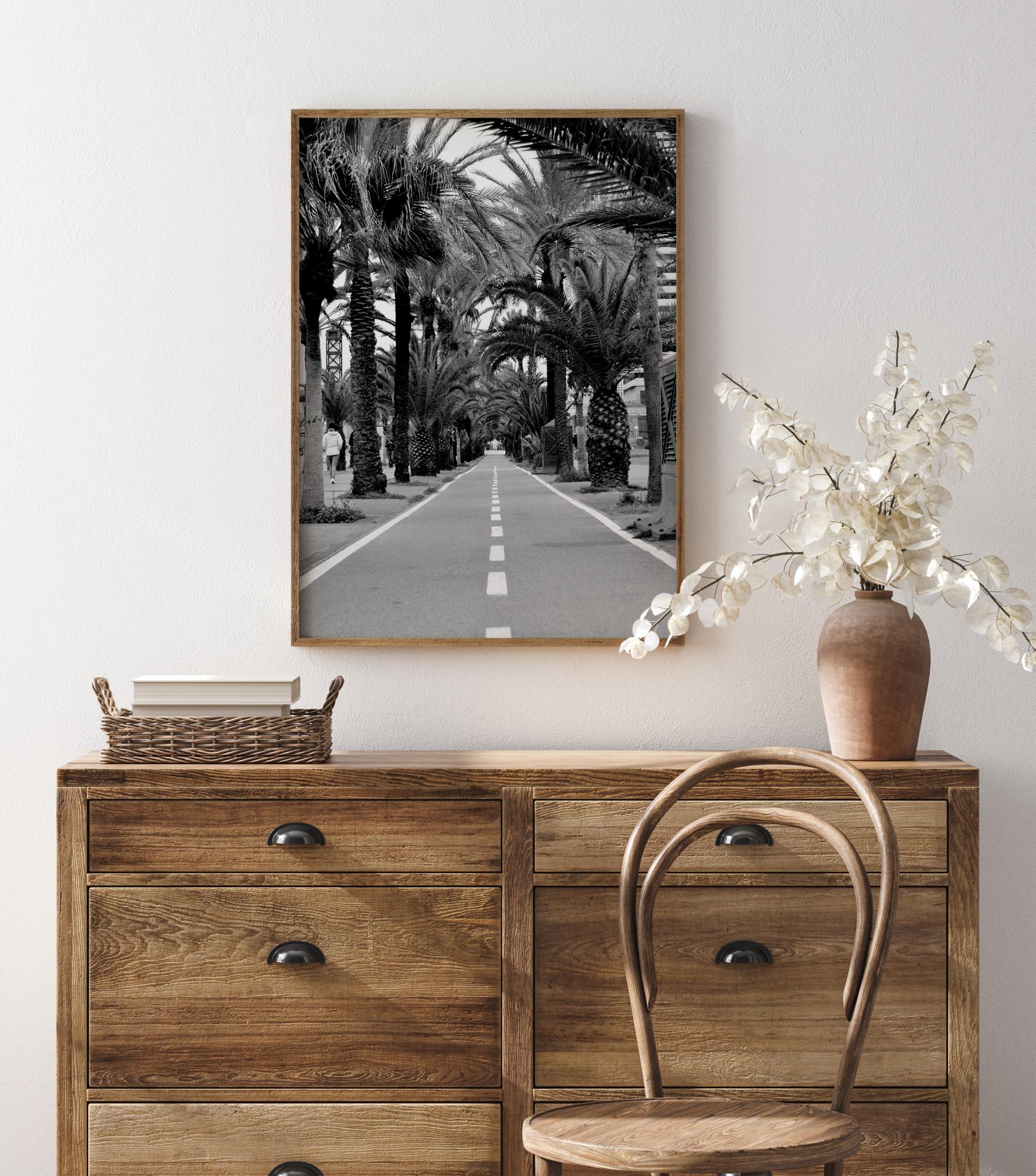 Um póster de paisagem de uma estrada que percorre uma floresta de palmeiras. As palmeiras criam uma fronteira para a estrada, enquanto as linhas brancas se estendem ao longe. As árvores criam um arco que direciona o olhar para uma nova direção. Coloque essa beleza em preto e branco na parede para uma sensação exótica.