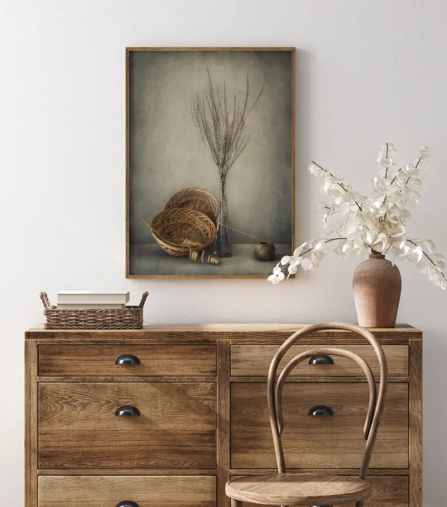 Um póster de natureza morta com cestas, um vaso de barro e uma garrafa de vidro com grama seca. Esta obra possui sutis tons sépia e cinzento que formam uma obra suave e harmoniosa. Tenha um pouco de tranquilidade em casa com este póster e combine-o com uma parede neutra para que ele não se destaque demais.