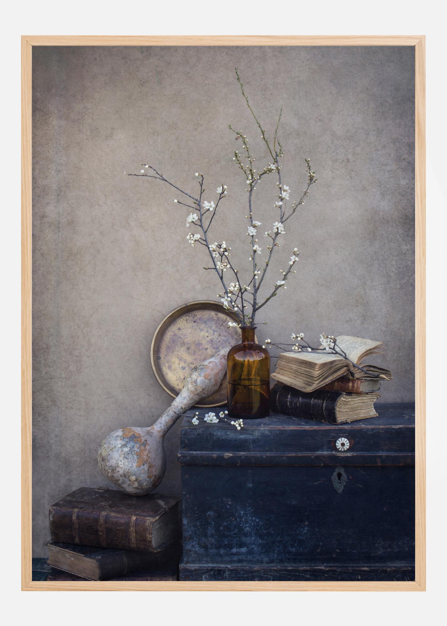 Um póster de natureza morta de um baú azul com um vaso, um prato, livros antigos e flores em botão. A natureza morta está num fundo cinzento simples, o que faz com que o baú azul se destaque centralmente. Se quiser ter uma sensação rústica, pode colocá-lo numa parede neutra e desfrutar das flores de primavera em botão nos galhos nus.
