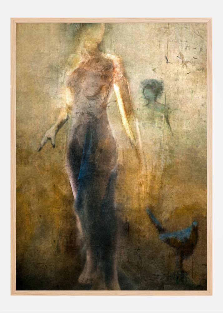 Capte o olhar com este pôster místico e sugestivo que parece contar uma história além do visual. O motivo explora temas de identidade e memória através de uma figura que emerge de um fundo inspirado no grunge. O elemento abstrato da obra de arte surge através da aparição difusa, quase fantasmagórica, da figura e das sutis insinuações de uma silhueta no fundo, enquanto um pássaro solitário parece flutuar livremente.