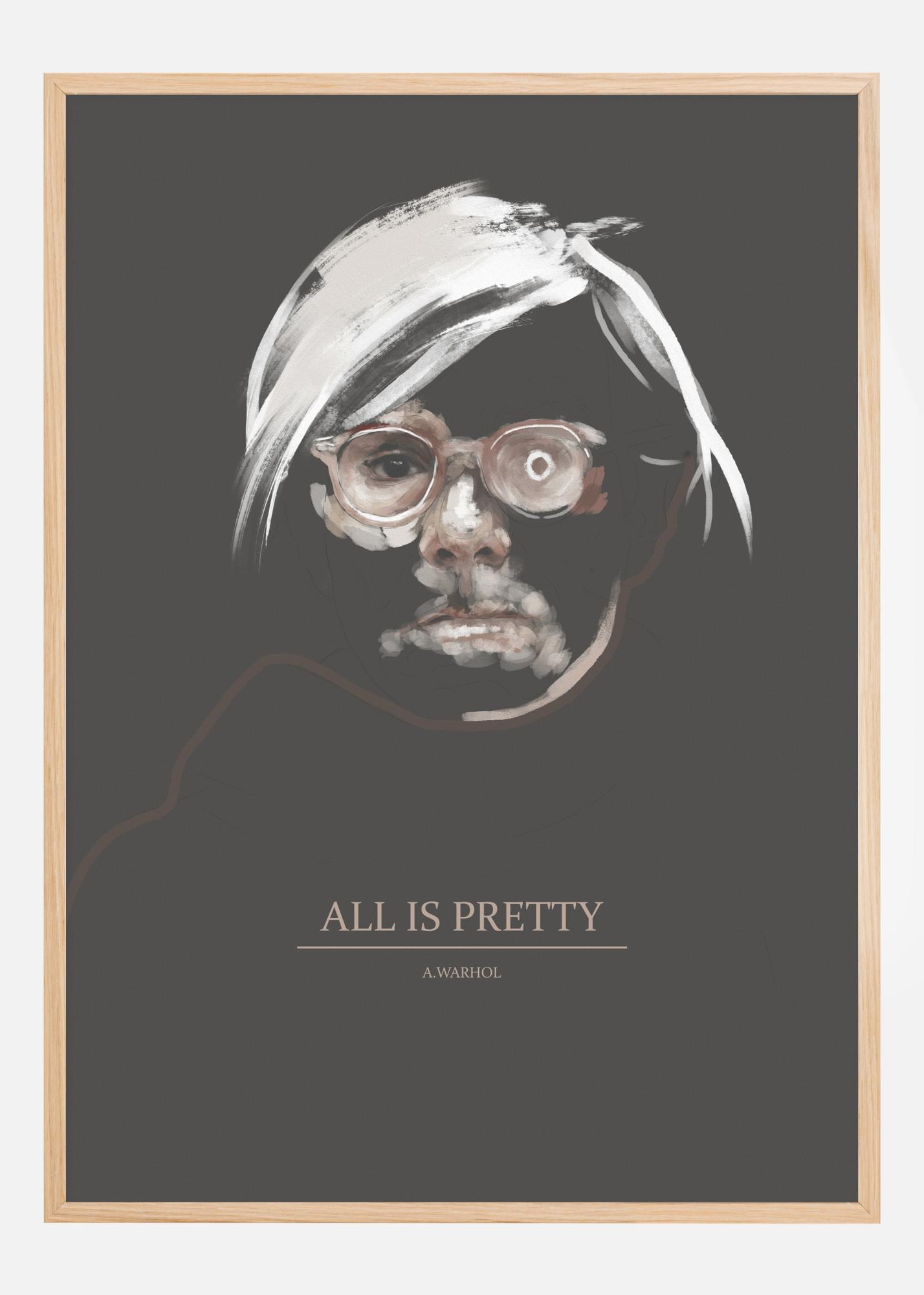 Um póster de arte de Andy Warhol. Este retrato do artista mostra seu cabelo branco e foca nos seus olhos, um calmo e um selvagem. Um slogan - Tudo é Bonito - está presente na parte inferior, para lhe fornecer uma citação inspiradora e uma mensagem quando passar pelo póster pendurado em sua casa.