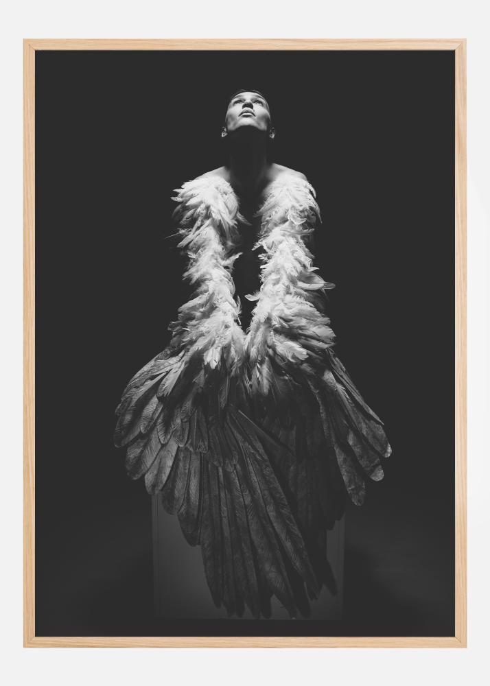 Um retrato de um homem vestido com um traje de penas longas para imitar um voo no ar. Ele está em pé contra um fundo preto e olha para cima para o céu. Um holofote brilha de cima, destacando seu rosto e ombros, fazendo com que automaticamente se concentre nele ao olhar para esta obra dramática.