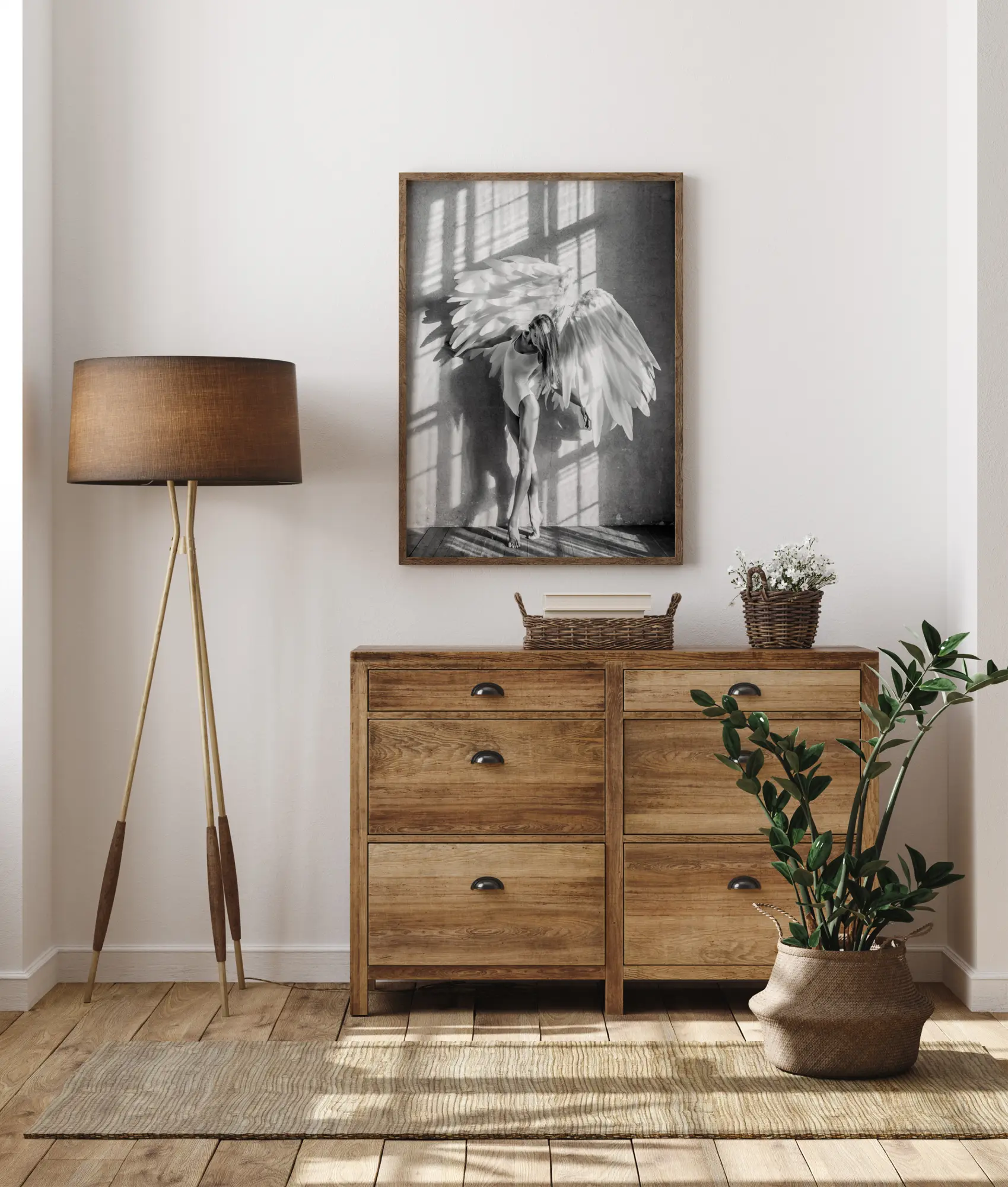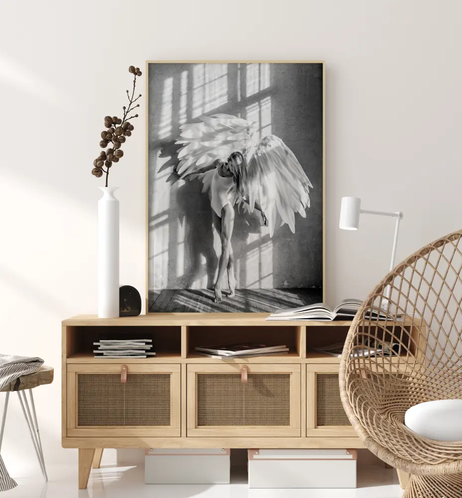 Um belo póster de arte fotográfica em tons de cinzento suave de uma mulher posando como uma bailarina com um par de grandes asas de anjo à luz de uma janela gigante cujas sombras se projetam sobre a imagem. Este é um póster para aqueles que desejam um toque a suave e bonito em sua casa.