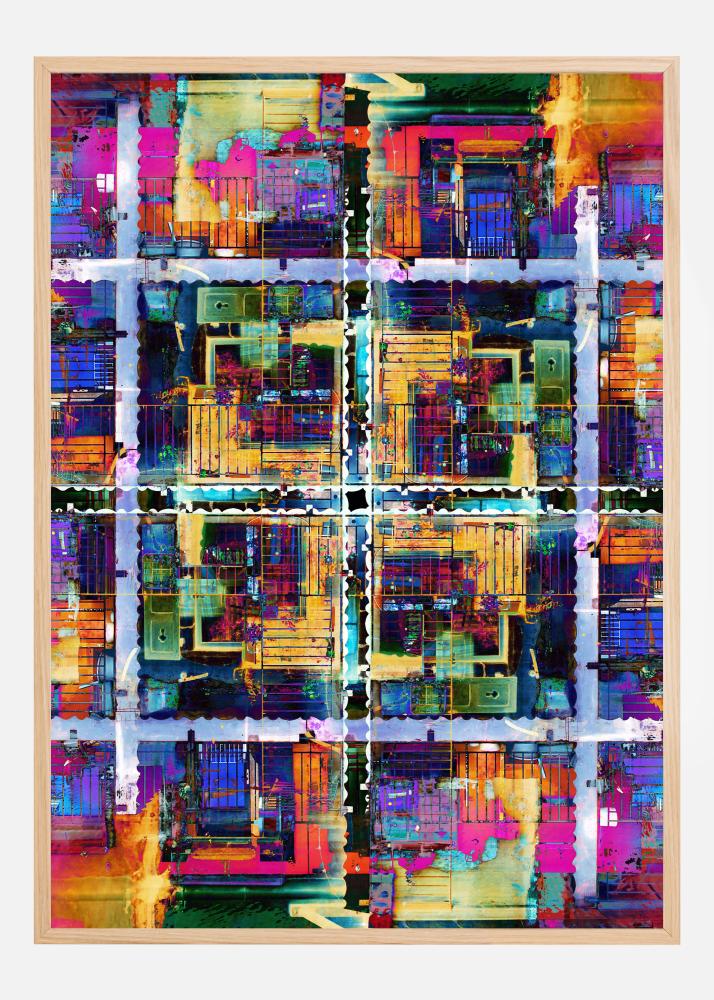 Um póster de néon cheio de padrões abstratos. Como um espectro de cores semelhante a uma mancha de óleo, esta imagem se assemelha a uma seção transversal de diferentes espaços. Cada quadrado está cheio de uma miríade de cores, tornando esta uma obra fascinante para se contemplar por horas - fica melhor se colocá-la numa parede neutra.