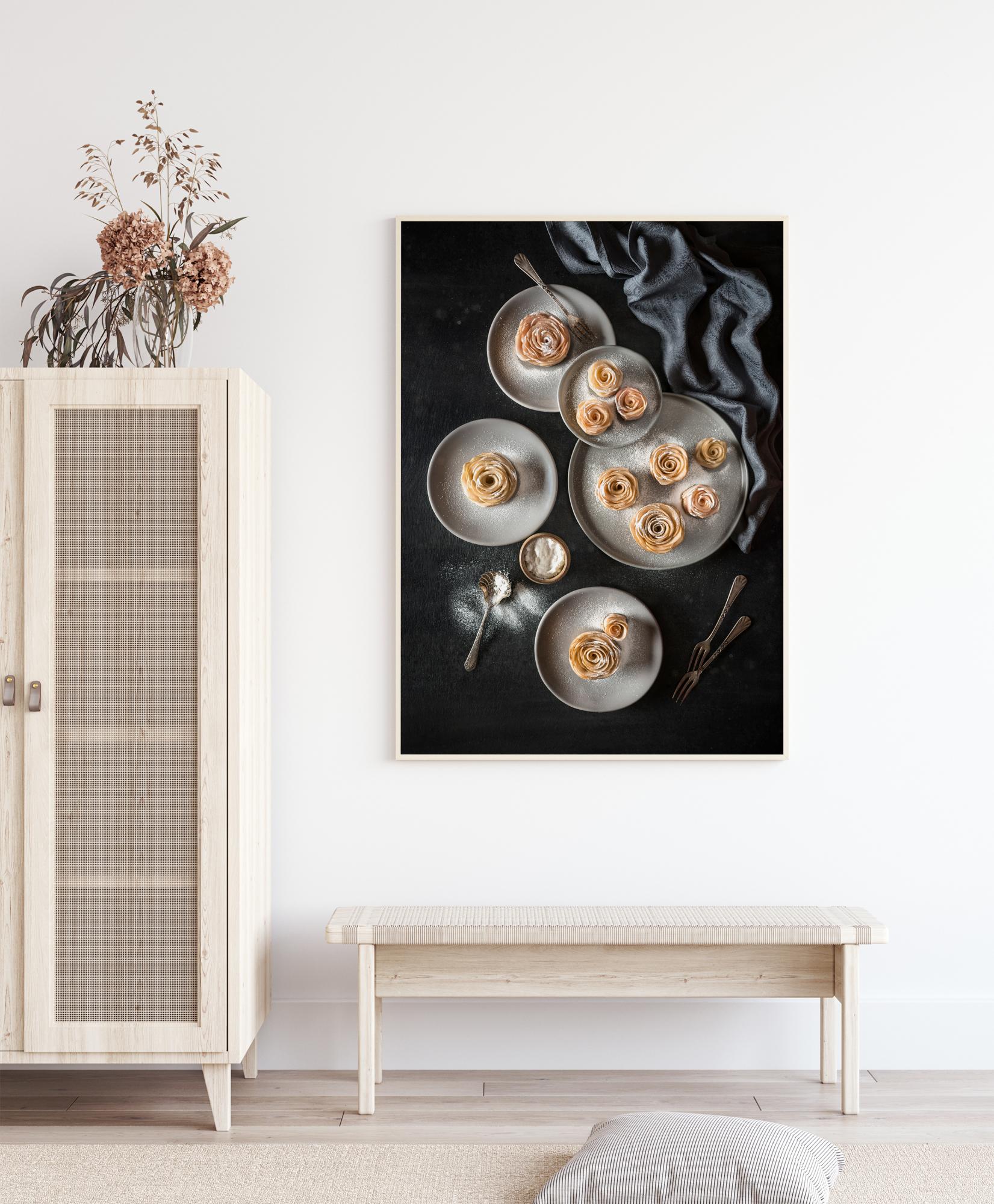 Um simples cartaz ao meio-dia completo com bandejas de diferentes doces. Essas tortas de maçã são incrivelmente deliciosas, cada uma delas é polvilhada com açúcar de confeiteiro e moldada como uma rosa delicada. Os pratos brancos e os doces crocantes e dourados se destacam contra a toalha preta. Você vai se sentir pronto para algo doce com isso em casa.