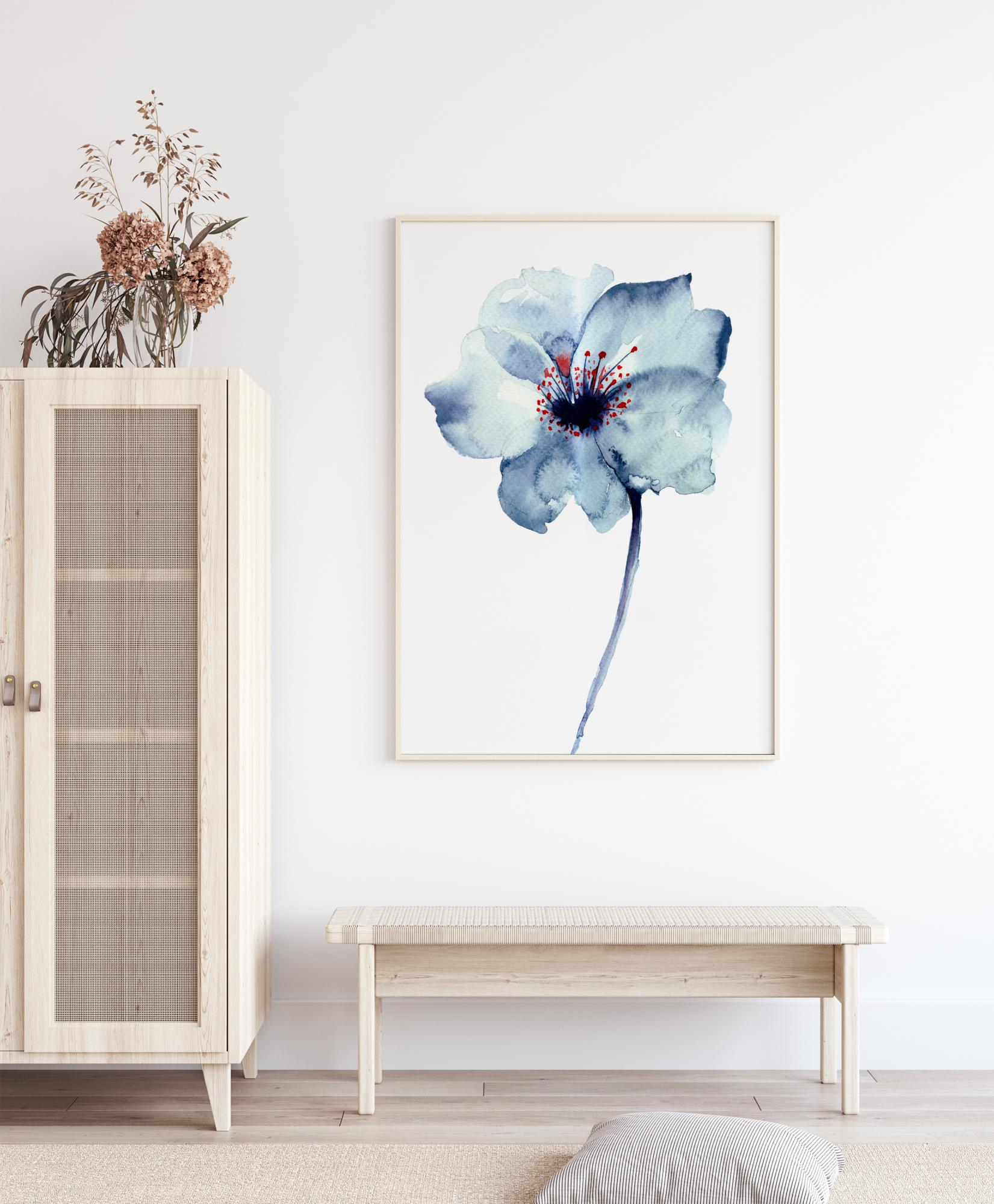 Uma flor majestosa pintada em aquarela azul e vermelha. Um belo póster em toda a sua simplicidade que se adequa tanto à cozinha ou ao corredor quanto à sala de estar ou ao quarto.