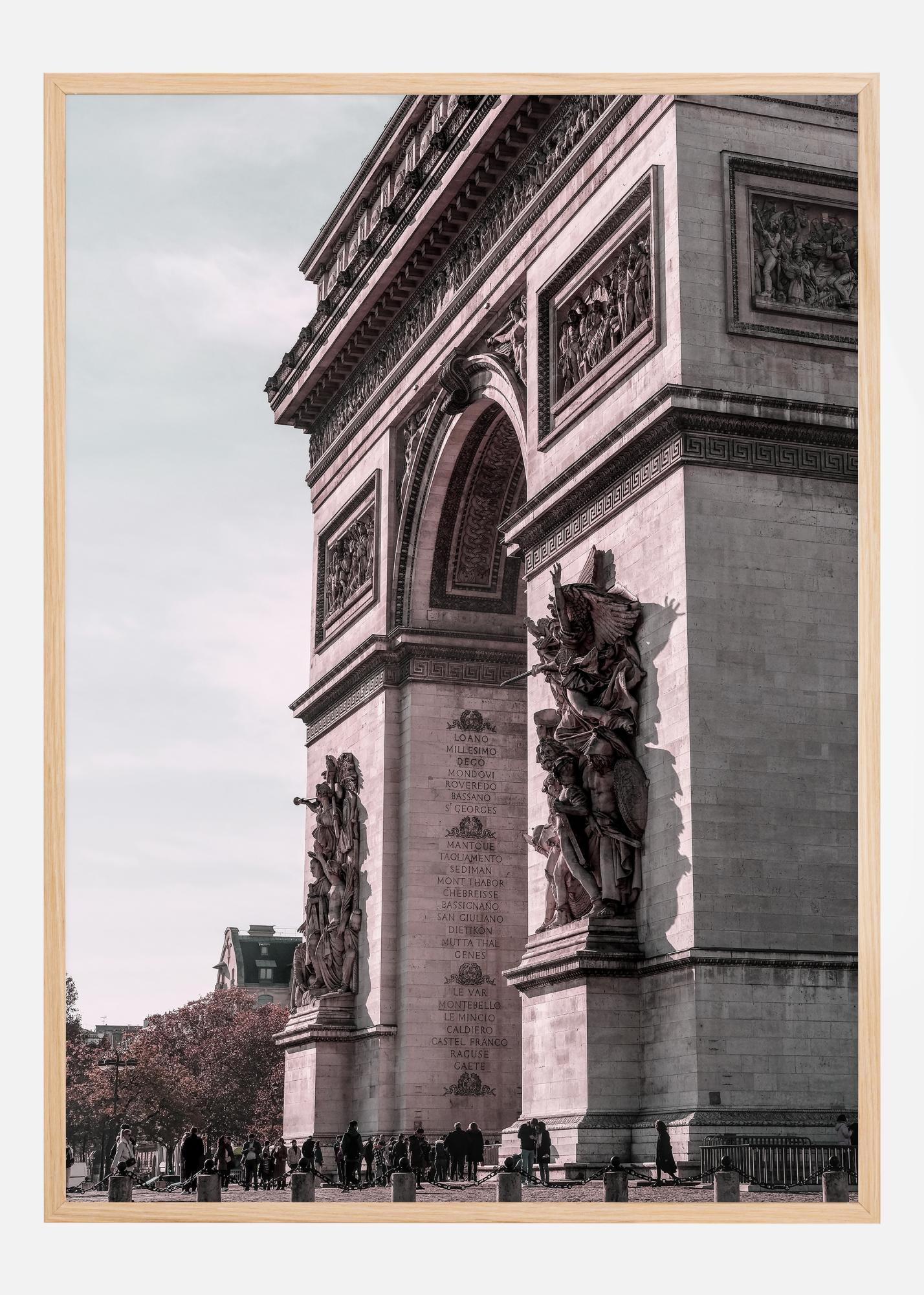Este elegante pôster destaca a majestosa e detalhada arquitetura do Arco do Triunfo em Paris. Nesta impressão única, a grandiosidade e a riqueza de detalhes do famoso marco são capturadas, desde as poderosas esculturas que adornam suas colunas até as finas ornamentações e inscrições que contam sobre sua importância histórica. Com um tom levemente rosa que cria uma atmosfera acolhedora, esta imagem é uma homenagem à história e arquitetura francesas, e torna-se uma adição culta a qualquer coleção de arte e pôsteres.