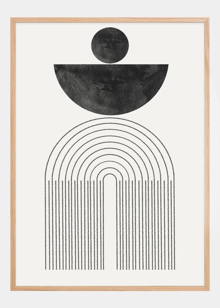 Este cartaz ousado e sugestivo é uma interpretação elegante dos ciclos lunares e da harmonia dos corpos celestes. A meia-circunferência preta e o círculo completo acima ilustram as diversas fases da lua, enquanto as linhas sinuosas abaixo lembram colunas arquitetônicas ou portais para outra dimensão. O contraste preto e branco da obra de arte proporciona uma sensação de elegância e misticismo que enriquece qualquer ambiente.