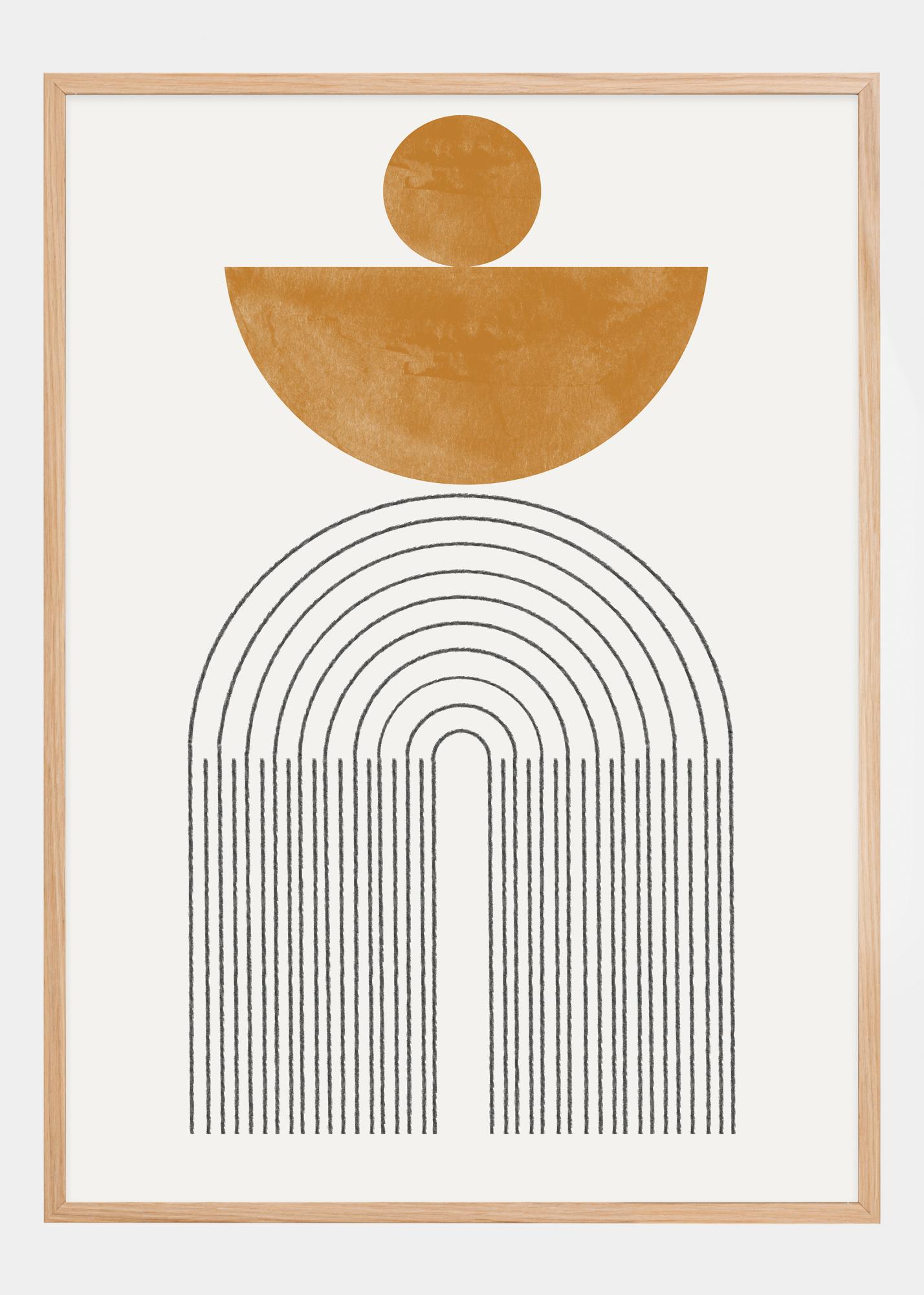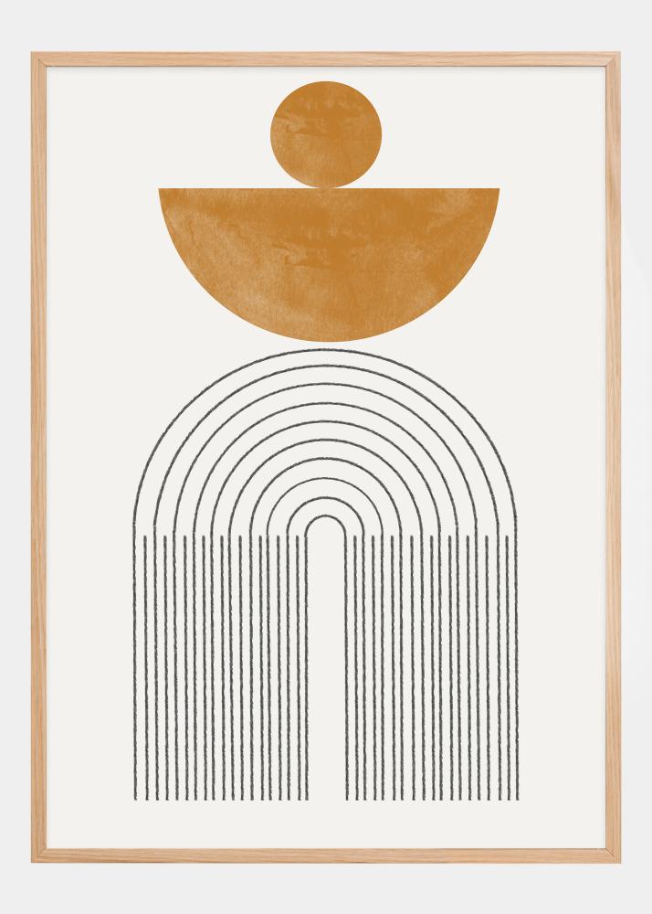 Este elegante pôster combina formas orgânicas e linhas limpas em uma composição que é ao mesmo tempo calmante e visualmente interessante. Um grande semicírculo ocre está posicionado como um pôr do sol sobre uma série de arcos, criando uma sensação arquitetônica de espaço e profundidade. No topo, o design é equilibrado por um círculo menor, lembrando o percurso do sol pelo céu.