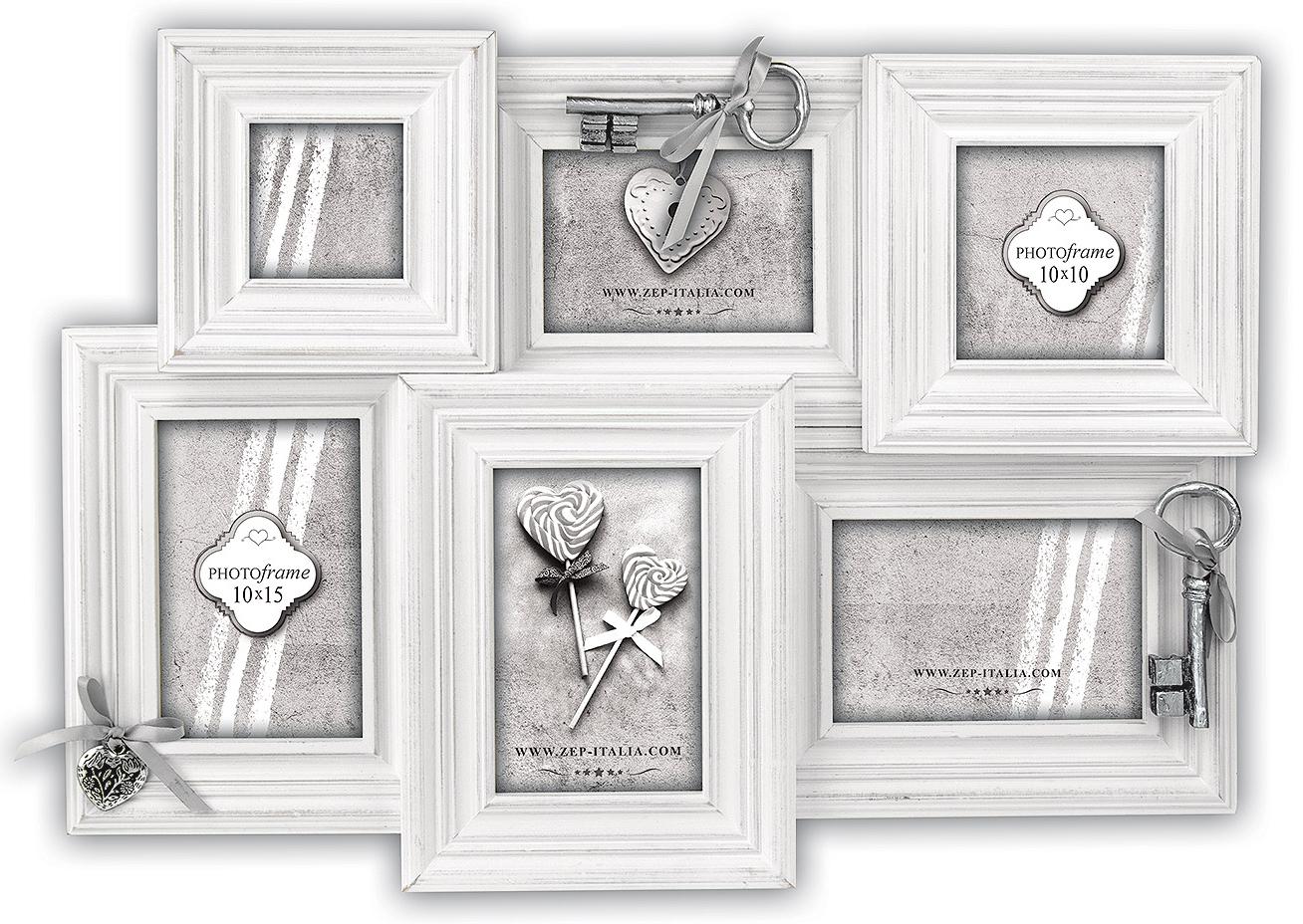 Imprima suas fotos favoritas e Coloque-as nesta moldura de colagem rústica com detalhes decorativos em prata. Esta moldura de colagem tem espaço para 6 fotos nos tamanhos 7x7 cm / 9x13 cm / 10x10 cm / 10x15 cm. A moldura de colagem é feita de madeira e tem um tom branco. Medidas externas de 53x37,5 cm. Suporte de parede incluído.