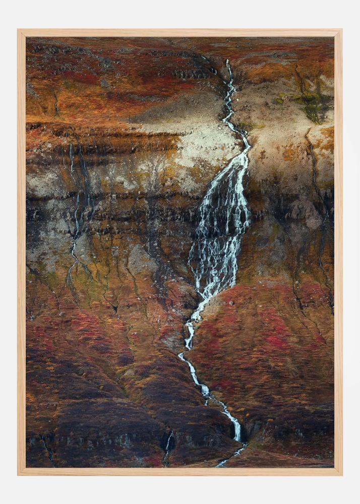 Um incrível póster da natureza com uma pequena cachoeira corrente sobre pedras cobertas de musgo. Cores amarelas, vermelhas e laranjas preenchem a imagem com tons quentes enquanto o riacho branco brilhante cascata sobre as rochas. Siga os movimentos da água neste fascinante póster enquanto o exibe em casa.