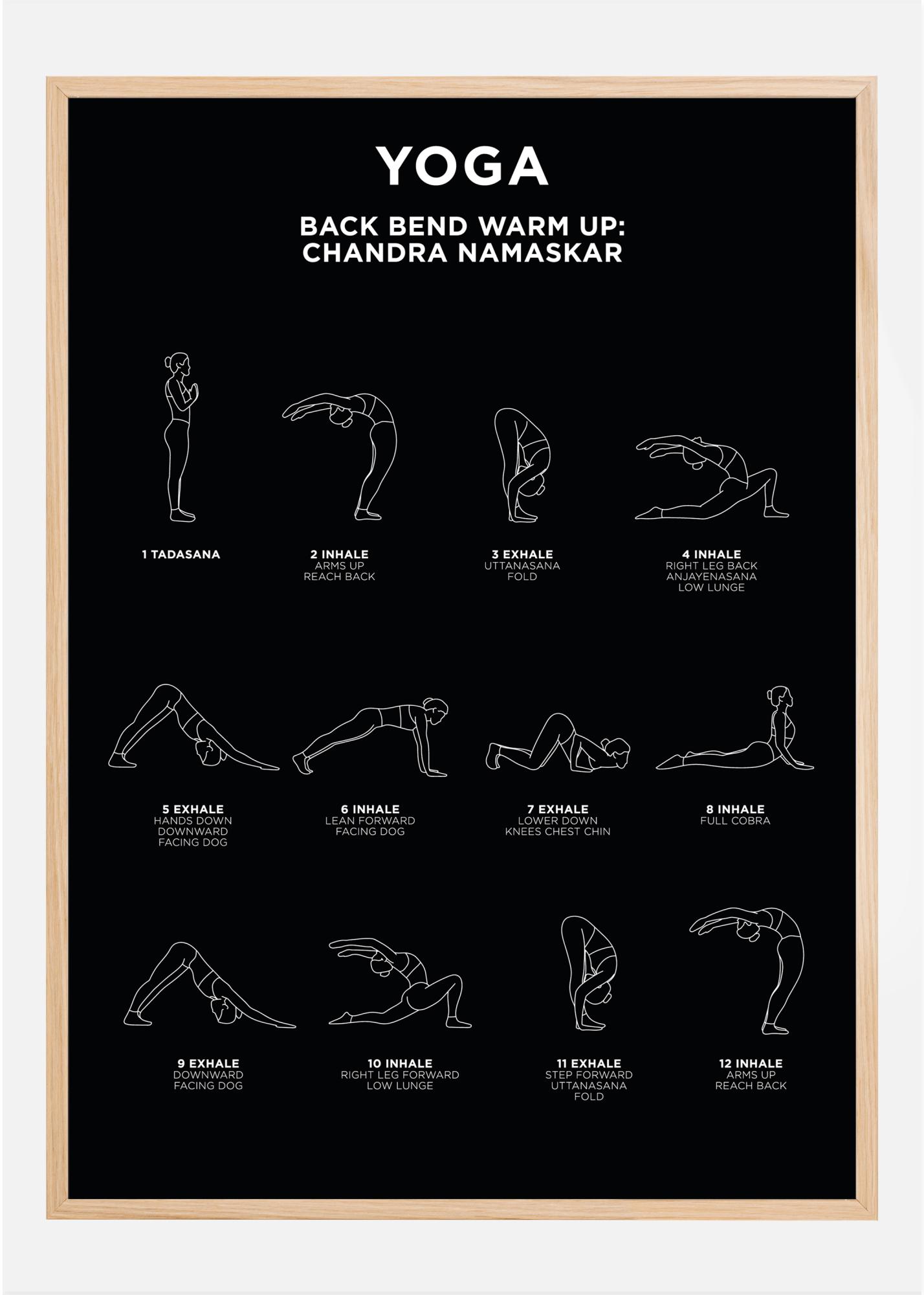 Pósteres trendy que podem ser combinados com outros motivos para criar uma parede de quadros na moda. O póster é elegante com um design minimalista, mas também serve como uma ajuda quando queres aprender um dos exercícios de aquecimento clássicos do yoga, “Chandra Namaskar”. O póster está disponível em preto ou branco e numa variedade de tamanhos.