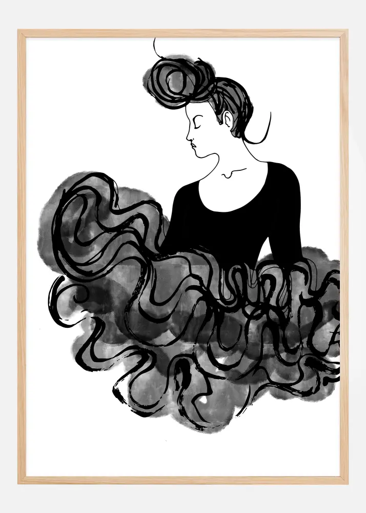 Introduza uma sensação de movimento e fluidez artística na sua casa com o nosso poster abstrato de bailarina. Esta elegante ilustração em preto e branco destaca uma figura feminina, capturada em um momento tranquilo, com o cabelo preso em um coque relaxado e um fluxo de formas abstratas e flutuantes que compõem sua saia. Estas formas fluidas, executadas em uma sutil escala de cinza, criam uma ilusão de movimento e a leveza da dança, como se fossem pinceladas de tinta varridas pela tela por um vento não intencional.