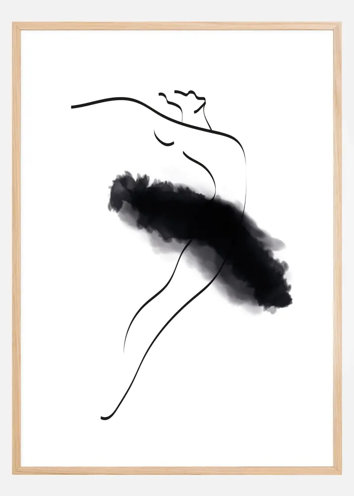 Uma aquarela de uma bailarina em linhas pretas finas com uma saia de bailarina preta mais pronunciada. Um póster minimalista e elegante que se adequa tanto ao quarto ou corredor, quanto à sala de estar ou biblioteca.