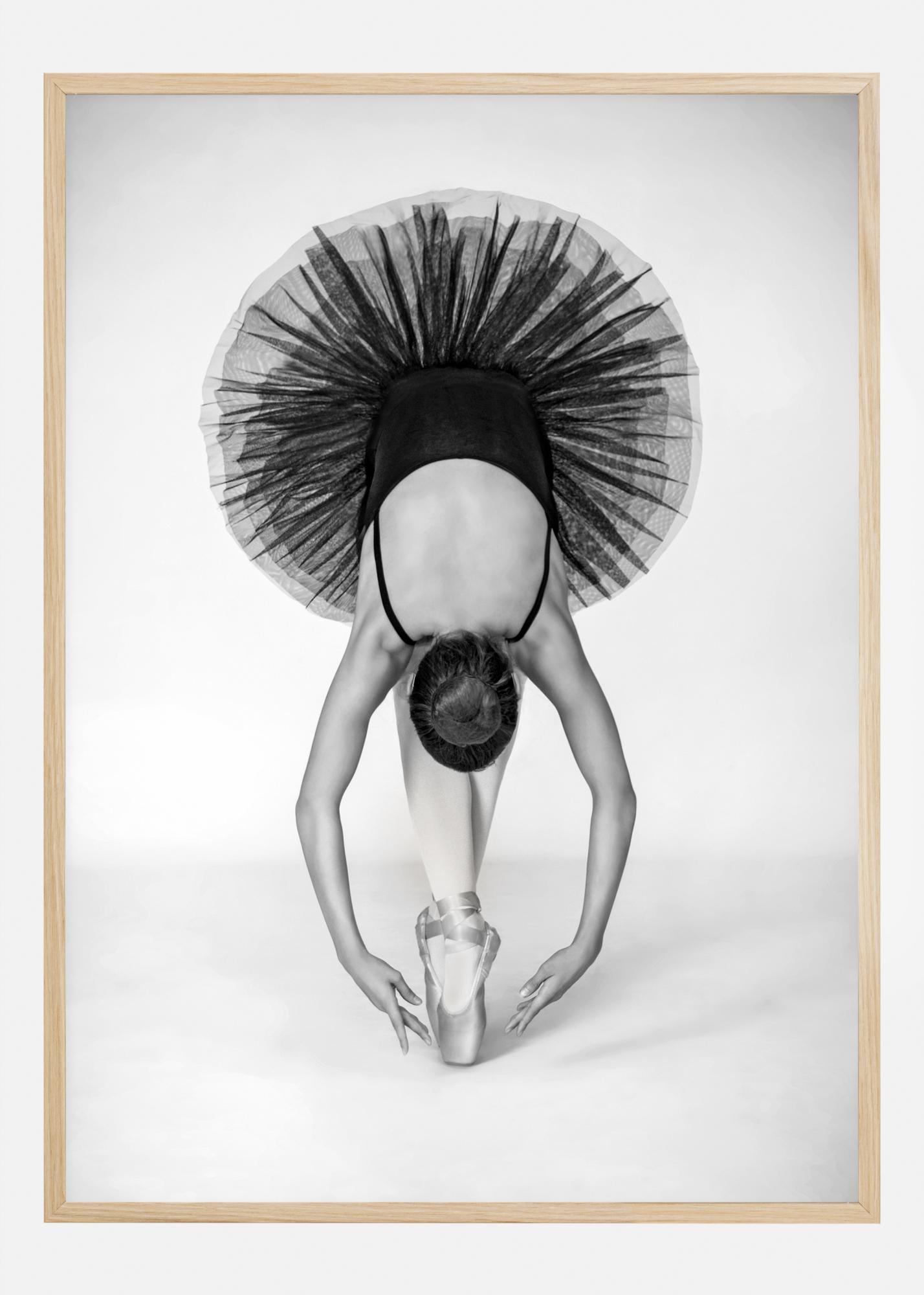 Um póster de retrato de uma bailarina. Esta dançarina de balé se curva para a frente na quinta posição e cria dois círculos perfeitos com o seus braços e uma saia de balé preta. O póster em preto e branco faz com que ela se destaque e cria uma aparência elegante e clássica que realça qualquer parede neutra simples em qualquer lugar da casa.