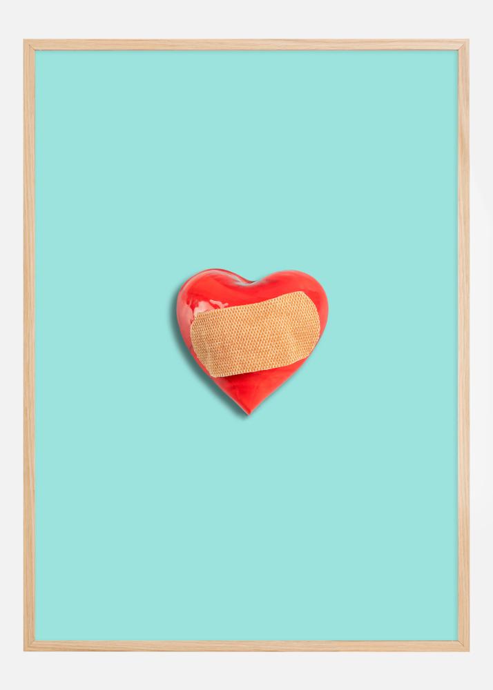 Este pôster provocativo mostra um coração vermelho com um curativo, contra um fundo calmante em turquesa. A simbologia é forte e aberta a interpretações, seja sobre curar um coração partido ou cuidar de nossas feridas emocionais. O contraste vibrante entre o coração vermelho e o fundo calmante dá à imagem uma ressonância profunda e emocional.