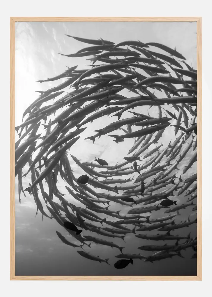 Um póster fascinante com um cardume de barracudas debaixo d'água. Observe esse peixe longo nadando em formação de tornado. Deixe o olhar seguir o padrão circular enquanto a luz de cima brilha delas, iluminando essa cena em preto e branco de maneira impactante.