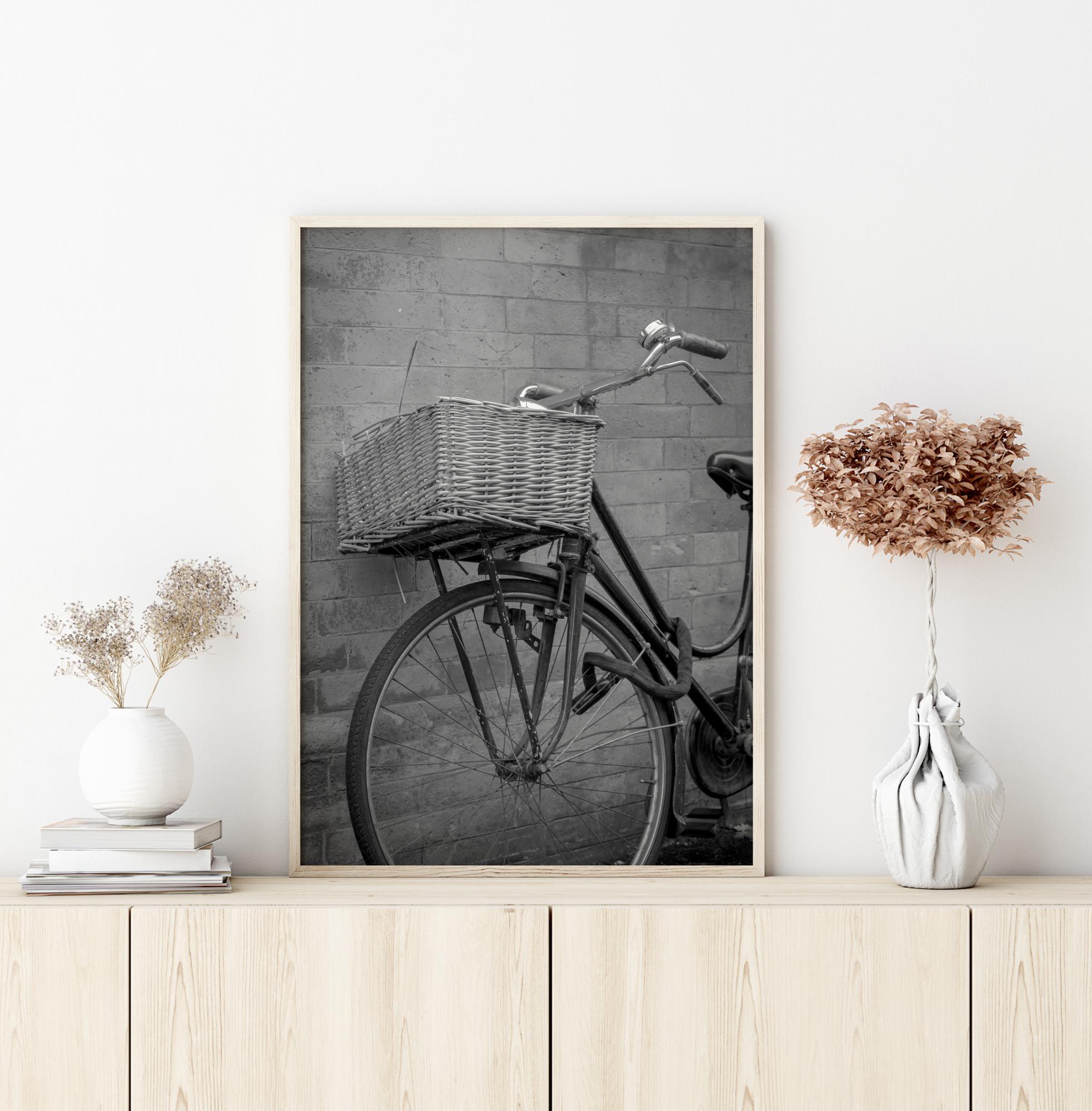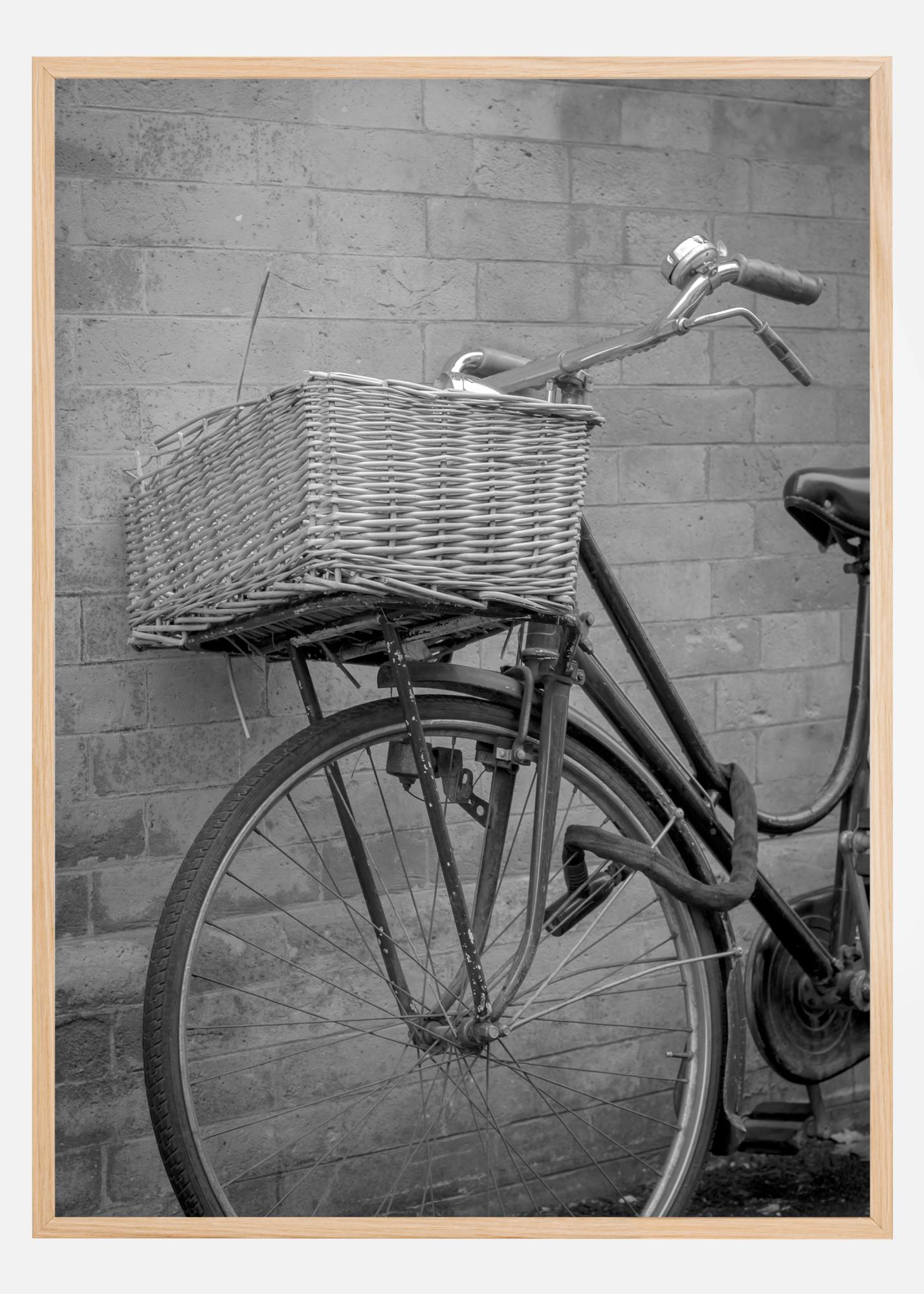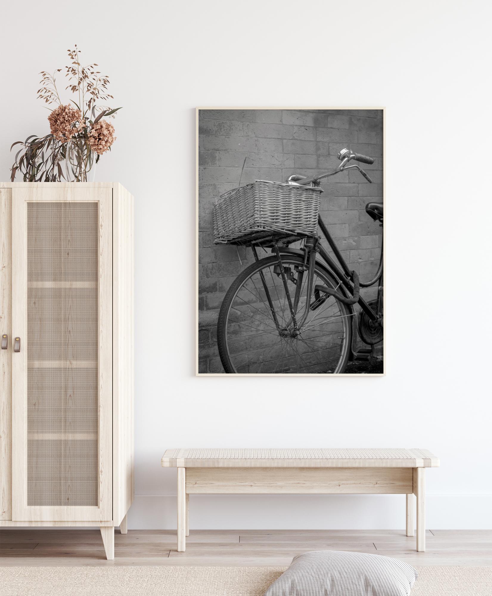 Um póster de natureza morta com uma bicicleta apoiada numa parede de tijolos. A cesta da bicicleta está em destaque e a moldura preta contrastante e o cadeado da bicicleta guiam o olhar ao redor do póster. Pendure esta imagem simples, mas elegante, numa parede clara para um efeito de bom gosto.