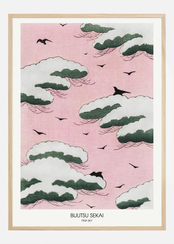 Este pôster tranquilo e poético intitulado "Bijutsu Sekai Céu Rosa" captura a essência de uma manhã ou noite calma com seu suave céu rosa como fundo para nuvens elegantemente flutuantes e silhuetas de pássaros voando. Esta impressão é um oásis de tranquilidade e seria perfeita para um quarto ou espaço de meditação, onde pode trazer uma sensação de paz e reflexão.