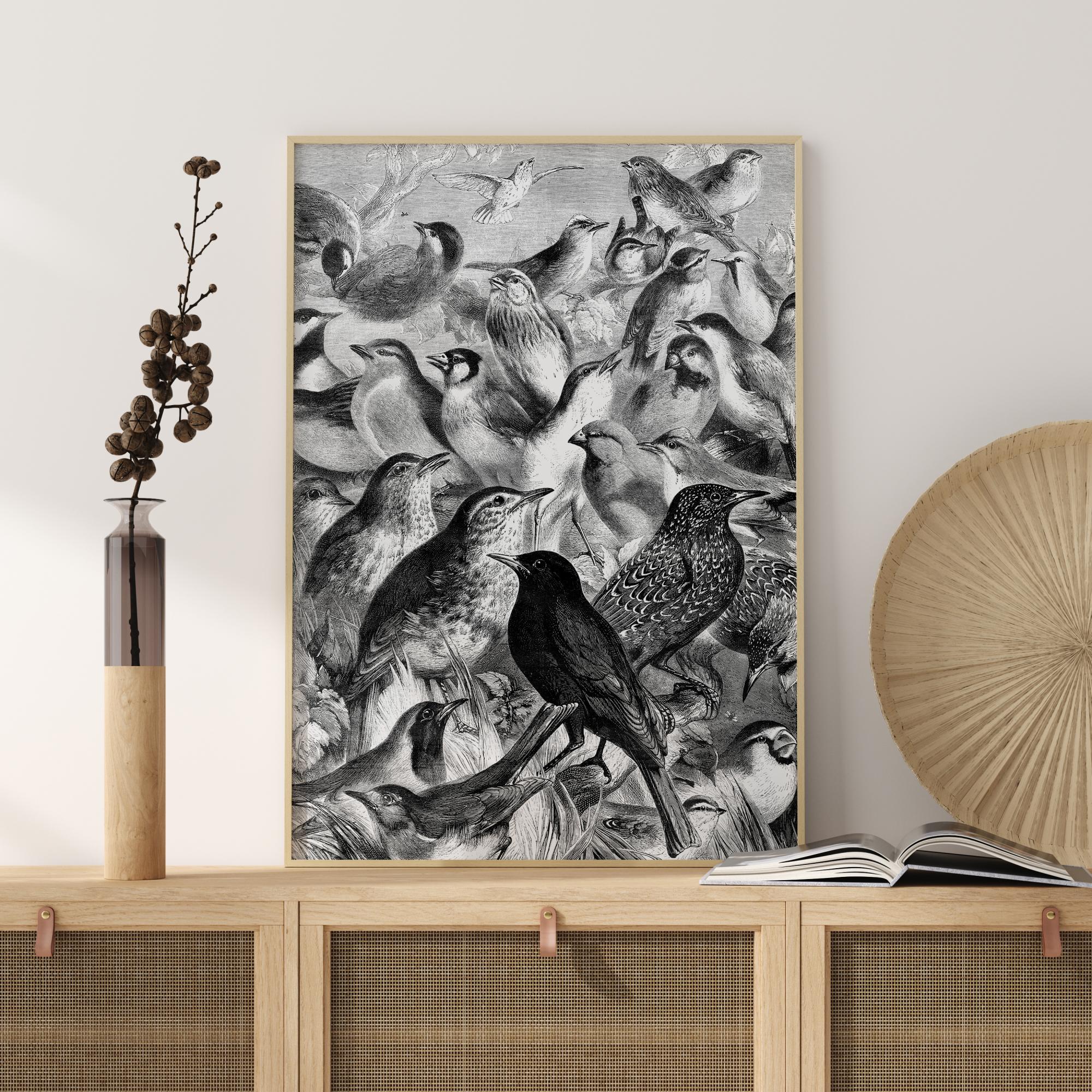 Um póster preto e branco com diferentes pássaros. Aprenda tudo sobre pássaros com a ajuda desta impressão com diferentes pássaros britânicos. Mantenha-se ocupado enquanto descobre os pássaros na imagem e aprende algo sobre eles. Permita que eles se destaquem ainda mais pendurando a imagem numa parede de cor clara.
