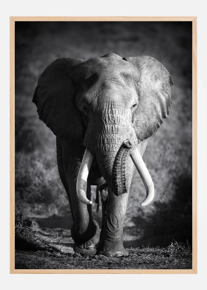 Este poderoso e cativante pôster retrata um elefante em preto e branco, destacando a pele enrugada e as grandes presas da magnífica criatura. A presença digna do elefante é capturada em detalhe, e seu olhar calmo oferece uma sensação de sabedoria e intemporalidade. Esta imagem é perfeita para qualquer pessoa que aprecia animais selvagens e a beleza poderosa da natureza e queira adicionar um elemento expressivo e reflexivo ao seu lar ou escritório.