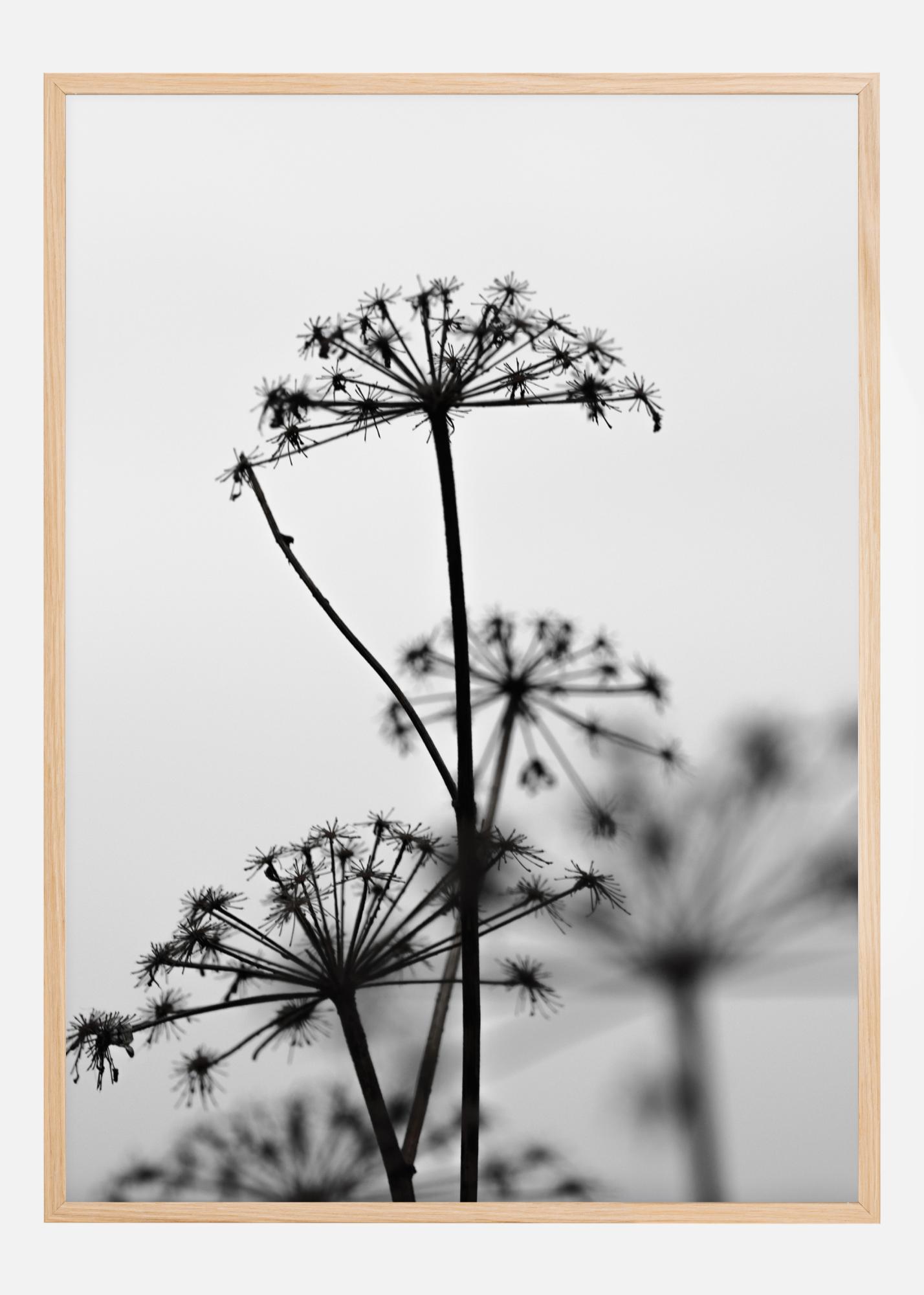 Um simples póster com plantas de flores em cacho em contraste com um fundo branco. As silhuetas pretas dos caules e cabeças de sementes dessas plantas de flores em cacho contrastam com o simples fundo branco. Pendure esta imagem fascinante numa parede colorida para destacar os detalhes das flores.