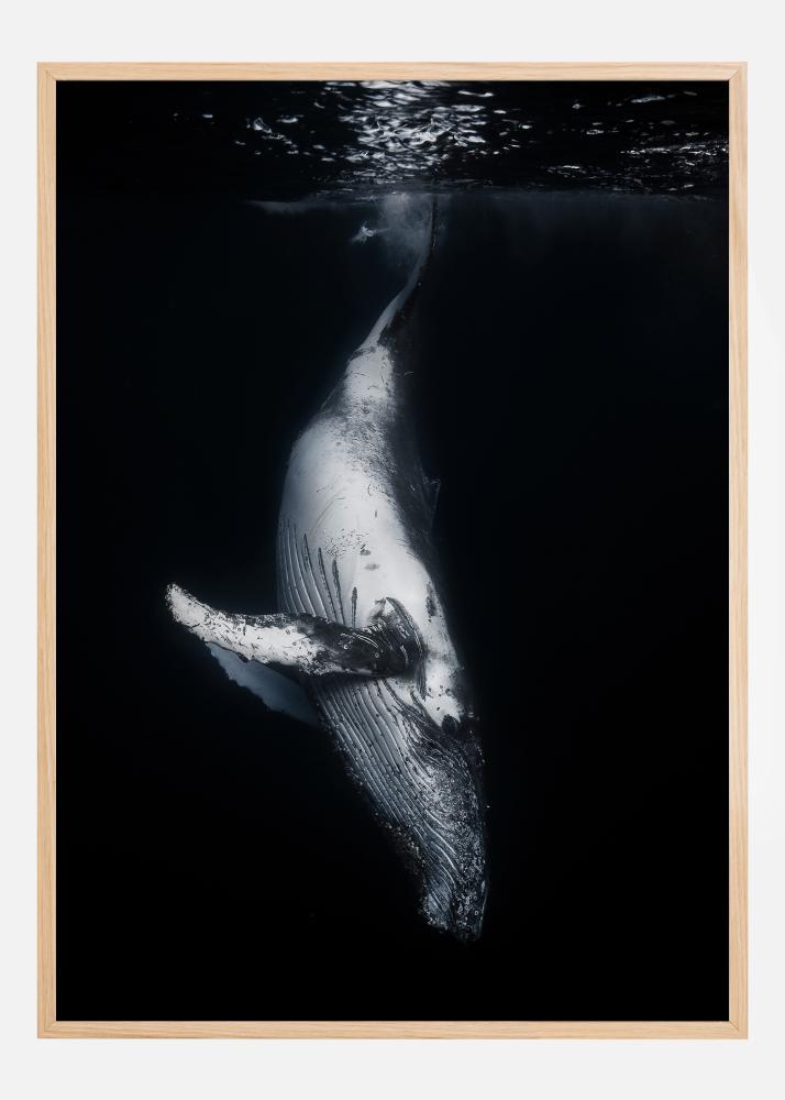 Neste póster retratado, é ilustrada uma baleia-corcunda que desliza graciosamente através das águas escuras, uma imagem que captura a essência da vida marinha. A composição contrastante em preto e branco realça a pele texturizada da baleia e as elegantes contornas do seu corpo, criando uma imagem poderosa de tranquilidade e graça sob a superfície.