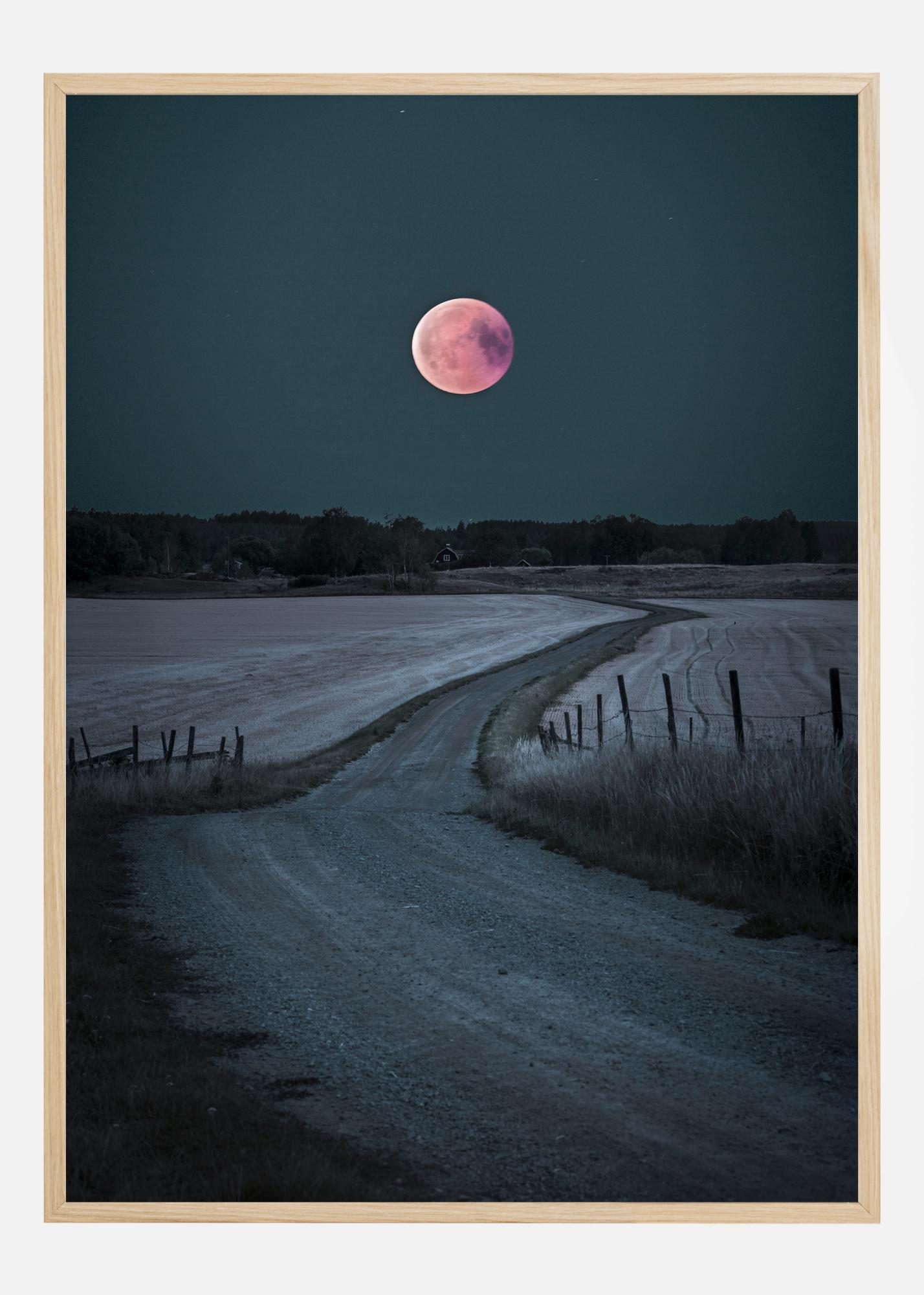 Um póster fantástico com uma paisagem coberta de neve e uma lua de sangue vermelho brilhante no centro. Uma estrada leva para longe no horizonte e atrai o olhar para a lua, que está baixa no céu. O cinzento e o azul contrastam com o vermelho e o rosa da lua para criar uma sensação de reverência nesta imagem noturna.