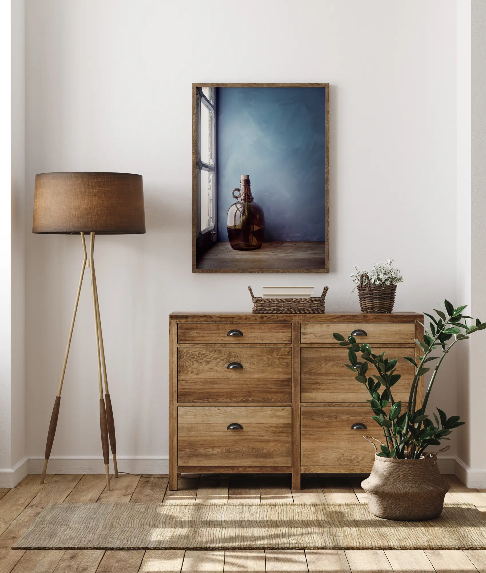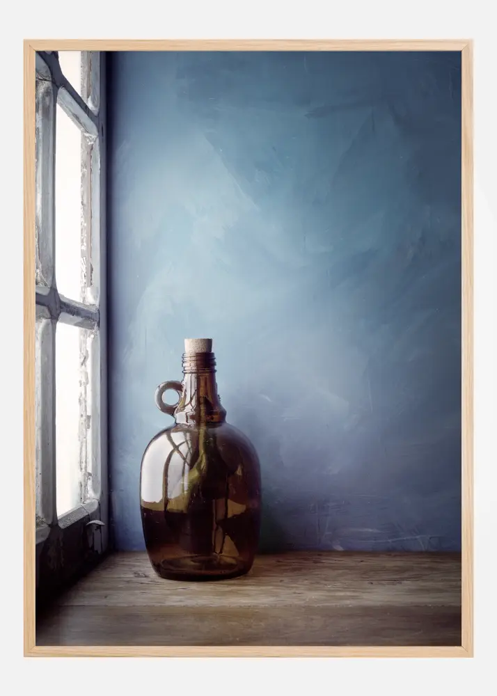 Um póster de natureza morta com uma garrafa marrom contra uma parede azul. A luz de uma janela entra pela esquerda, iluminando a garrafa e criando reflexos. Adicione uma sensação rústica à sua casa com a parede azul suave e a antiga mesa de madeira onde a garrafa está.