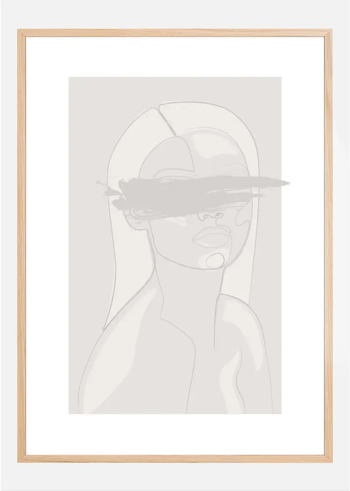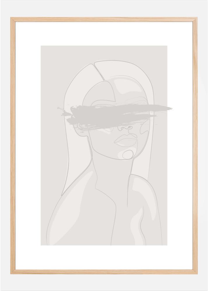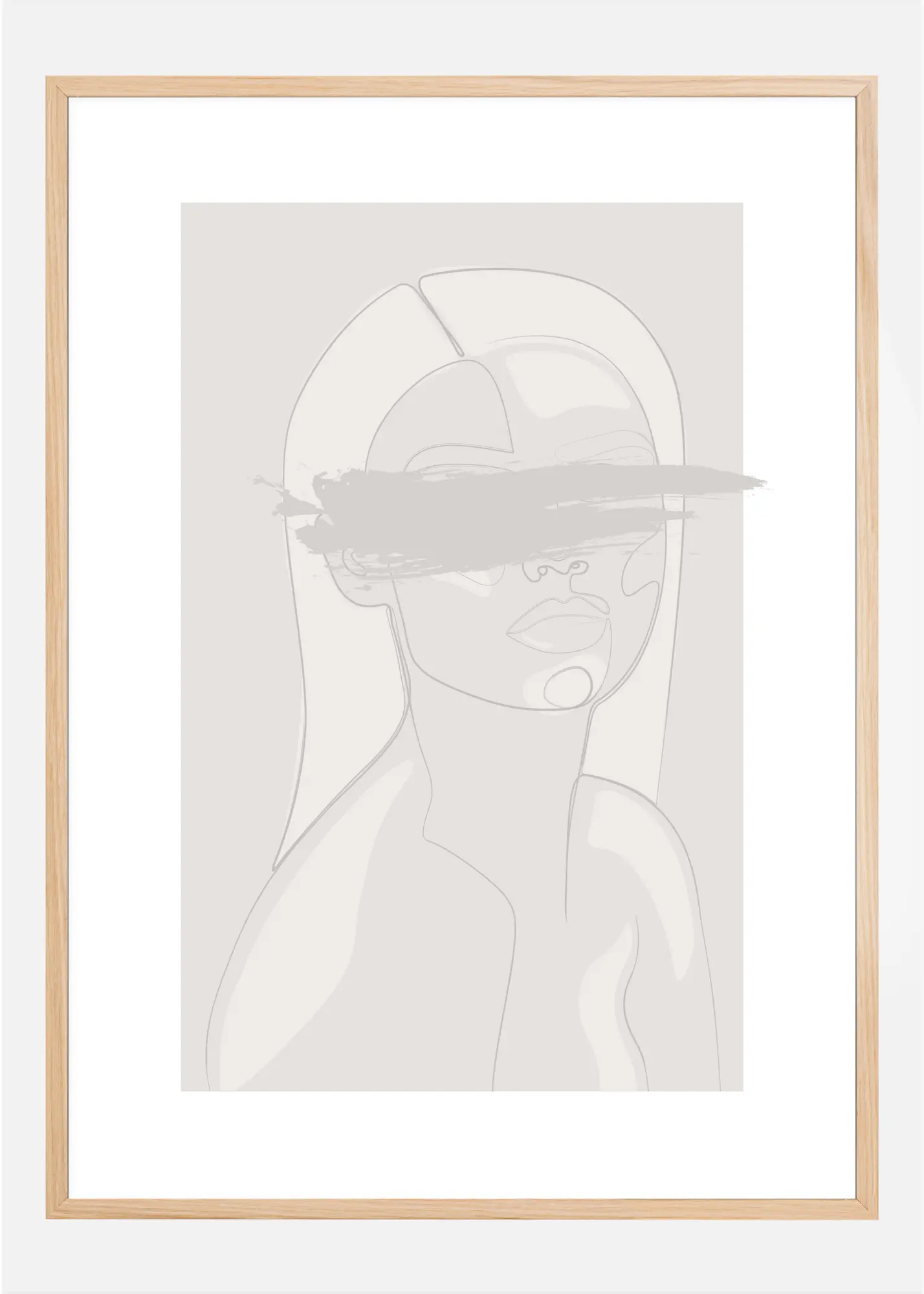 Um póster abstrato com uma mulher de olhos cobertos. Esta imagem tenue em branco e cinzento mostra a cabeça e os ombros de uma mulher em formas de blocos e linhas. Um toque de cor cobre os olhos, criando mistério em torno da mulher. Uma borda branca forte a enquadra, perfeita para pendurar numa parede de cor ousada em casa.