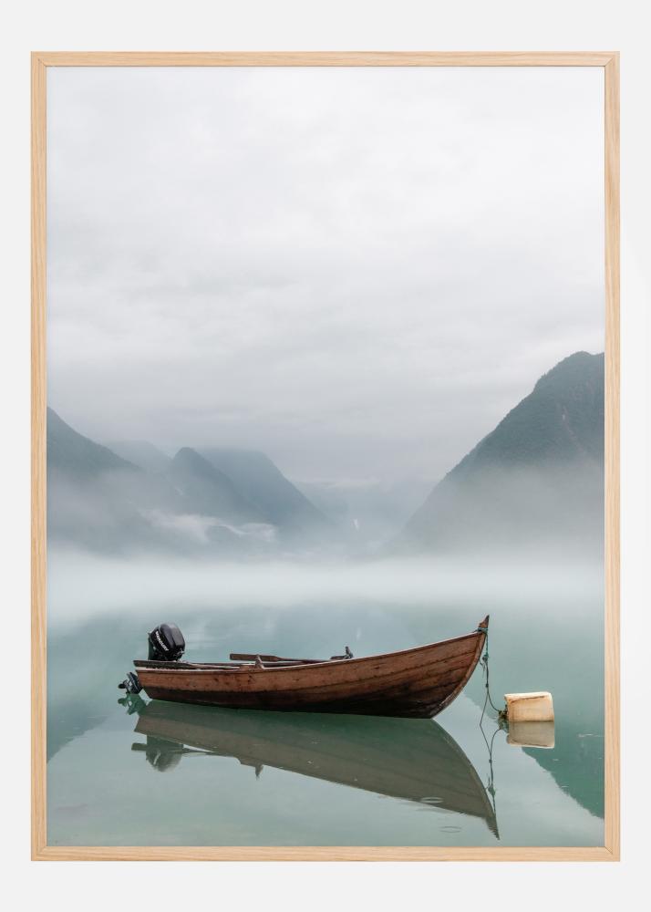 Um elegante póster com um barco no meio de um lago envolto em neblina. Um barco marrom se destaca em detalhes nítidos em primeiro plano, com um reflexo nítido na água. Ao fundo, envolto em neblina, estão montanhas suaves que emergem da água. Traga a tranquilidade de uma paisagem aberta para a sua casa.