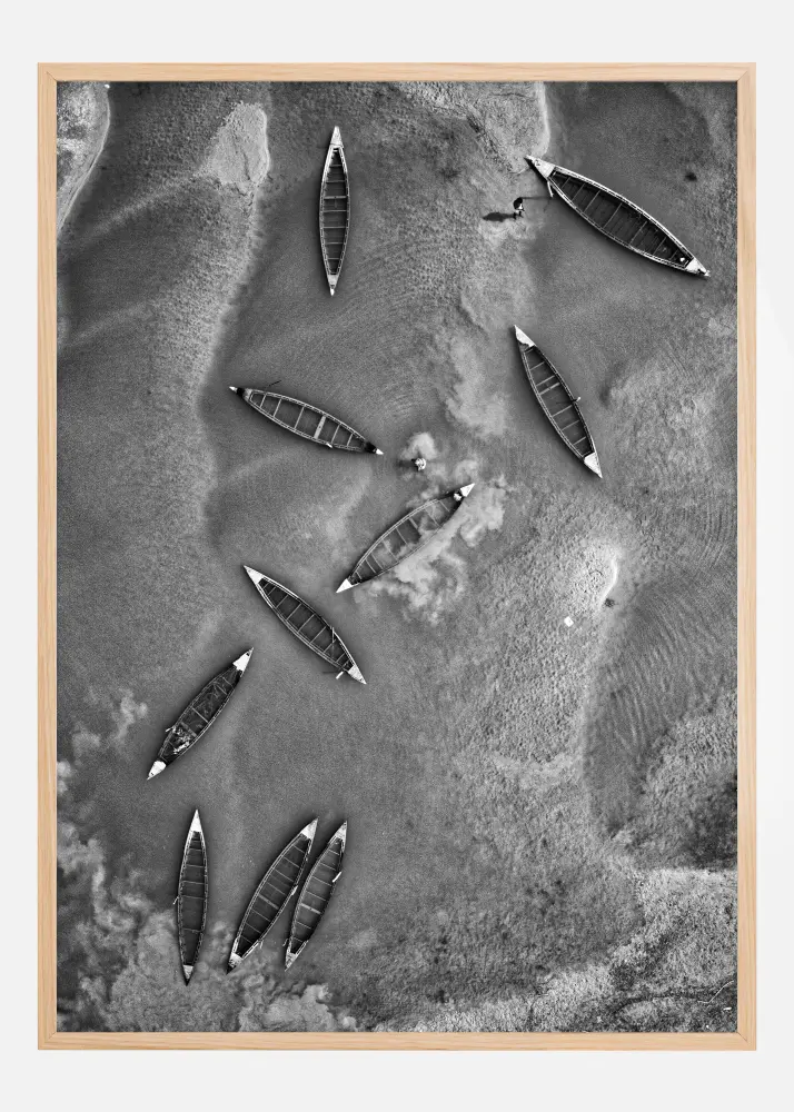 A riqueza de detalhes na imagem é impressionante, desde as nuances sutis no movimento da água até os contornos nítidos de cada barco. Este pôster oferece uma sensação de paz e reflexão e é uma representação fantástica da tranquilidade da natureza, bem como da interação humana com ela. Os diferentes tons de cinza e os jogos de luz e sombra criam uma textura viva que pode ser apreciada repetidas vezes. Esta impressão é uma verdadeira homenagem à simplicidade da vida, capturada em um momento de absoluta quietude.